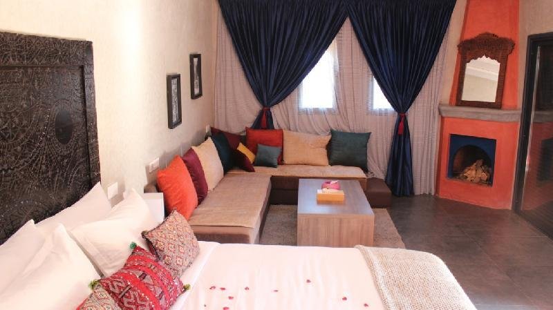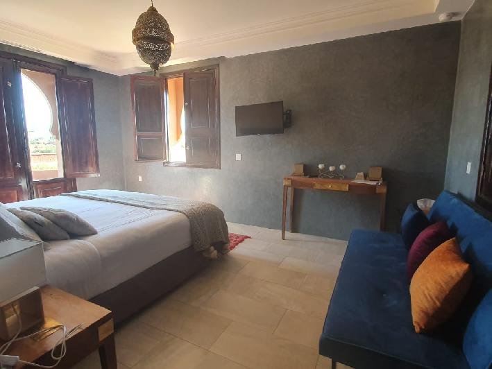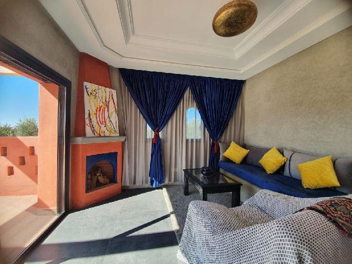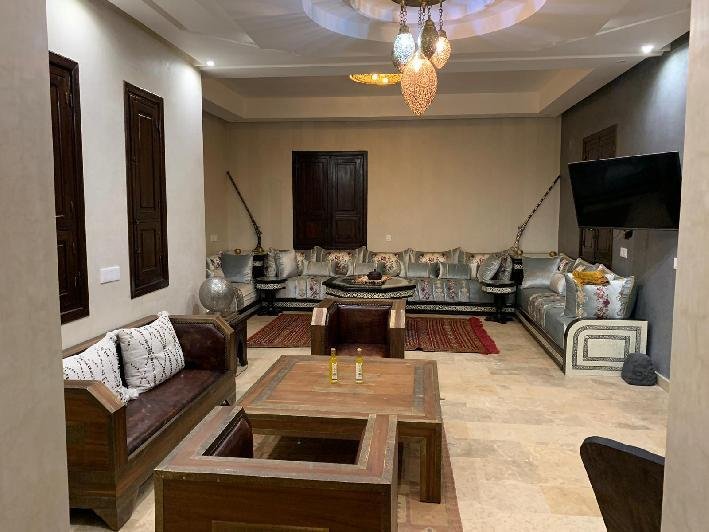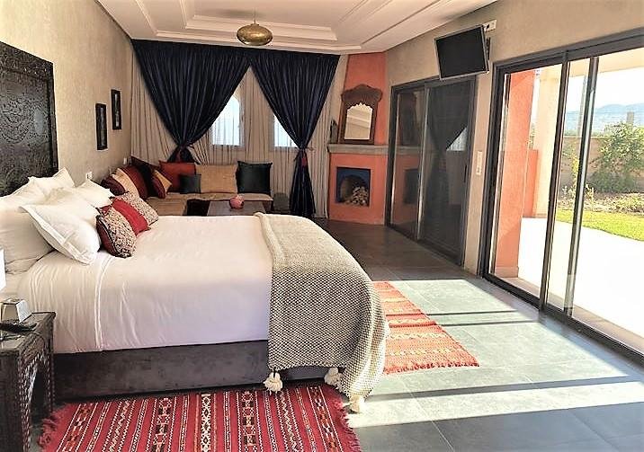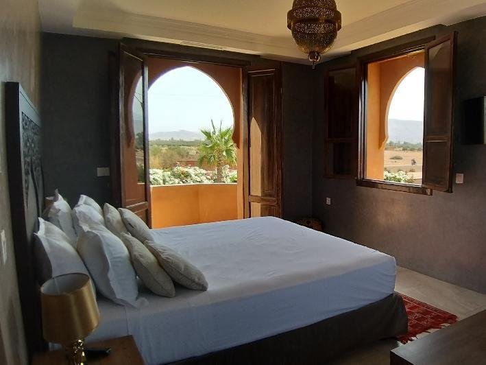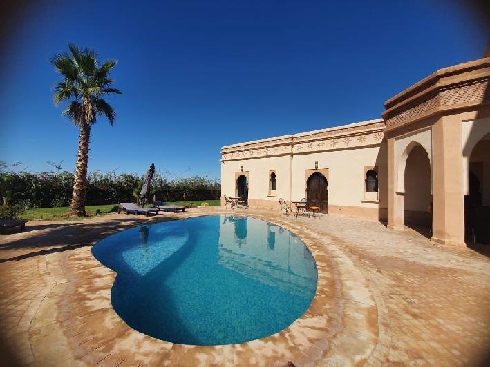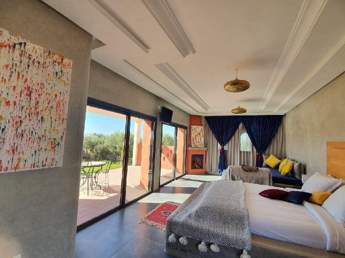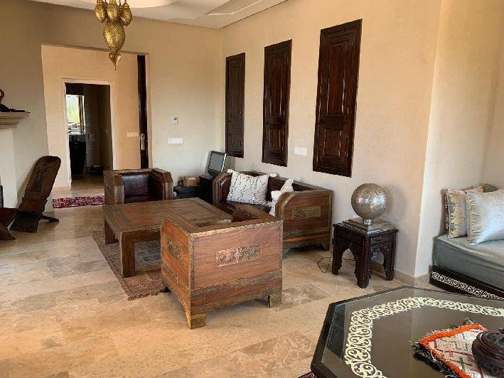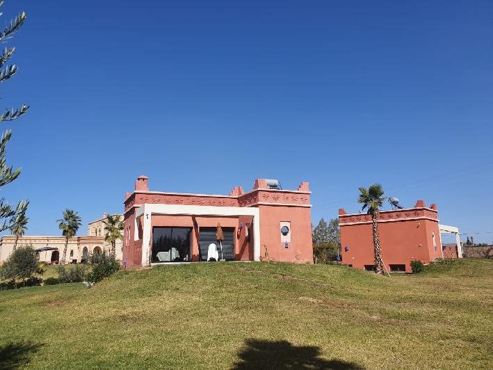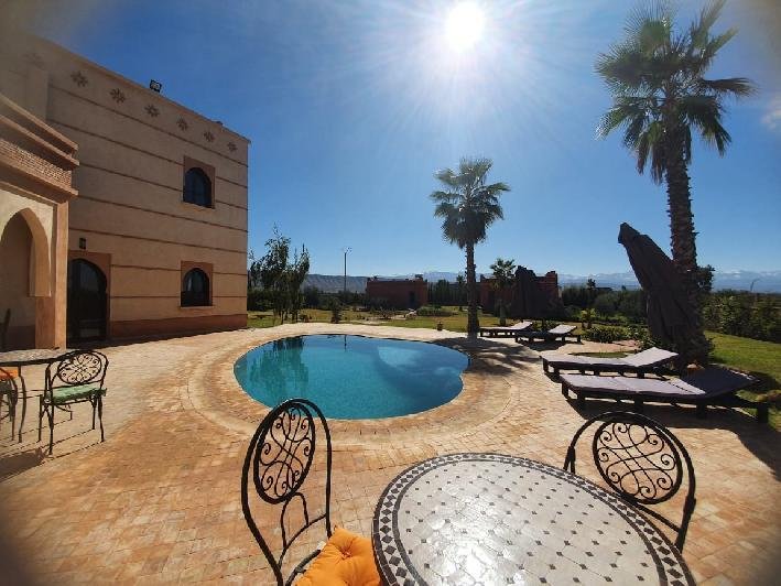 Avec une vue exceptionnelle sur l'Atlas et dans un cadre de détente et de calme, se niche cette villa de charme de style kasbah à l'extérieur sur 7000m² de terrain entièrement équipée et meublée, avec une belle architecture fusionnant entre modernité et traditionnel, située à 25km du centre ville de Marrakech sur la route de Ouarzazate avec une bonne piste godronnée. Cette grande propriété vous offre une villa principale ,2 autres pavillons indépendants,et un Appartement indépendant, disposant en plus d'un Hammam/SPA avec une salle de massage et une salle de repos. La villa principale composée au rez-de-chaussée d’une entrée principale, d’un spacieux salon avec cheminée, d’un espace salle à manger, d’une salle d’eau invités, d’une cuisine équipée avec une buanderie, et 2 chambres à coucher avec salle de bain privative. est d’une surface habitable de 320 m²r A l’étage, 2 grandes chambres avec salle de bain privative chacune, ainsi qu’une grande terrasse avec une vue imprenable sur l’Atlas. Les pavillons disposent chacun, d'une grande suite d'une superficie de 70m² ouverte sur une grande terrasse privative face à l'Atlas. Chaque suite royale possède son coin salon avec cheminée et sa salle de bain privative. Un appartement d'une chambre, SDB cuisine, est aussi annexé à la grande villa et pourrait servir de logement de fonction ou être loué en extension des chambres et suites existantes. A l’extérieur, il y a une belle terrasse aménagée ainsi que de la piscine et du spacieux jardin de 7000 m² et aussi une place de parking, un logement pour le gardien.