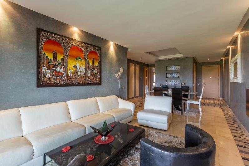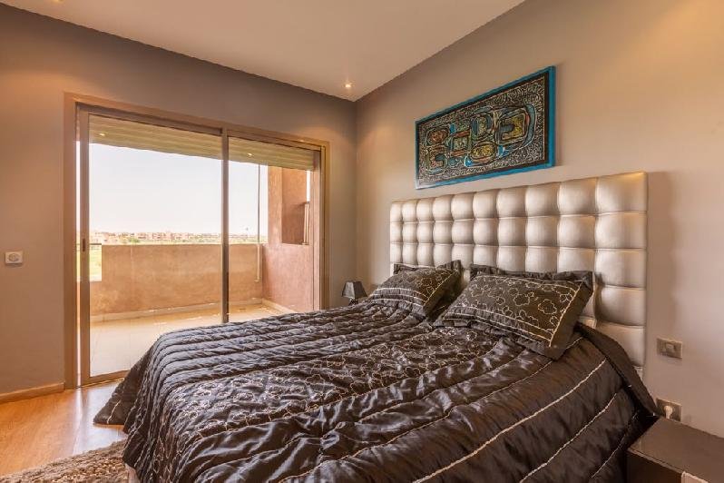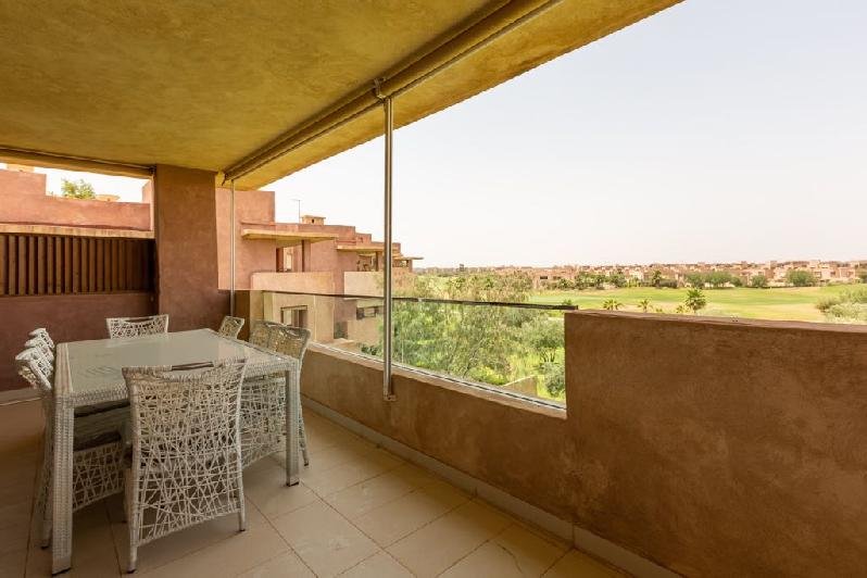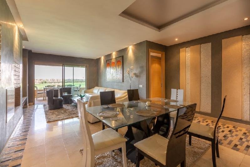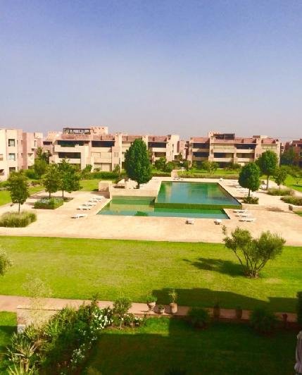 Situé dans une résidence golfique avec beau jardin et piscine un bel appartement à louer meublé d'une superficie de 135m² dont 20m² de terrasse, composé comme suit: - 2 chambres à coucher dont une ouverte sur la terrasse; -2 SDB; -une cuisine équipée; -un salon moderne; -un coin salle à manger; le tout entouré d'une belle terrasse aménagée donnant une magnifique vue sur le golf et la piscine. Loyer : 14.000 dh H.C
