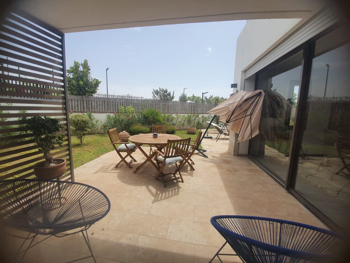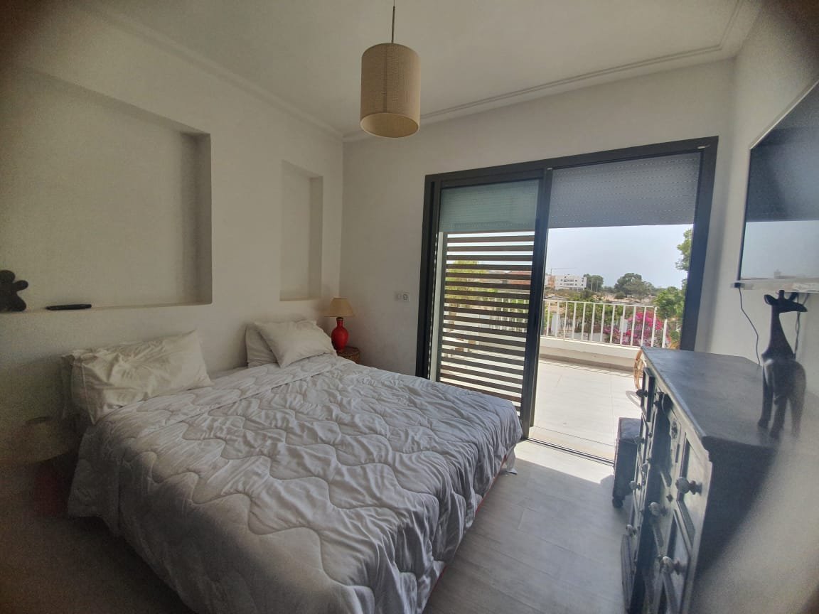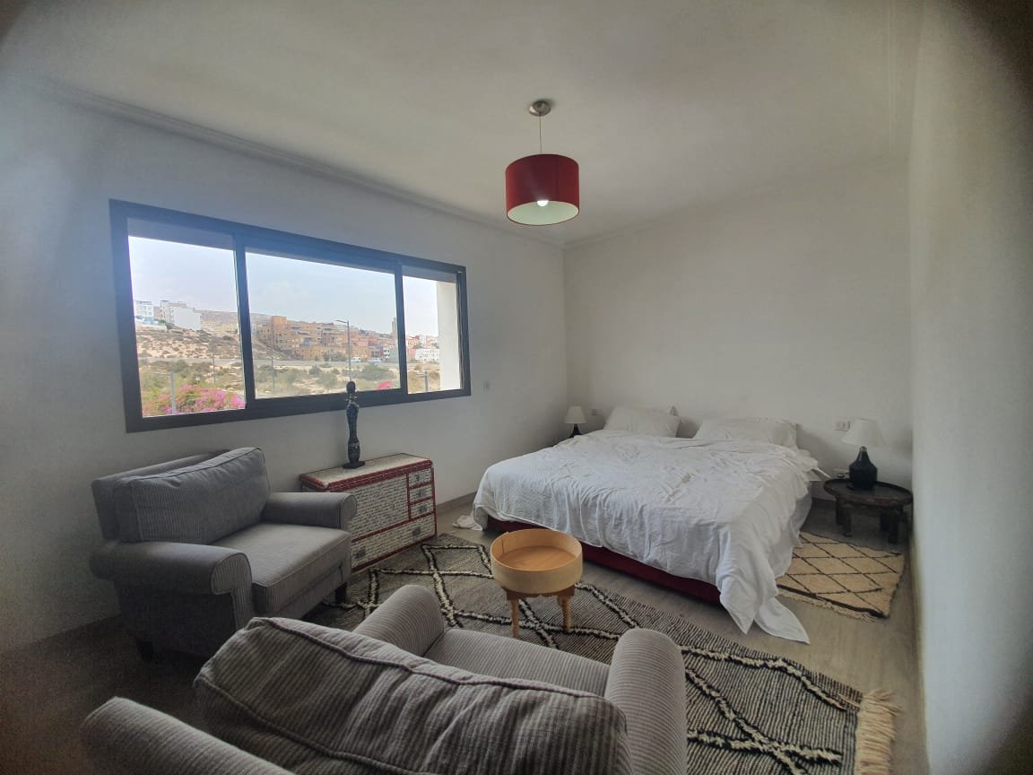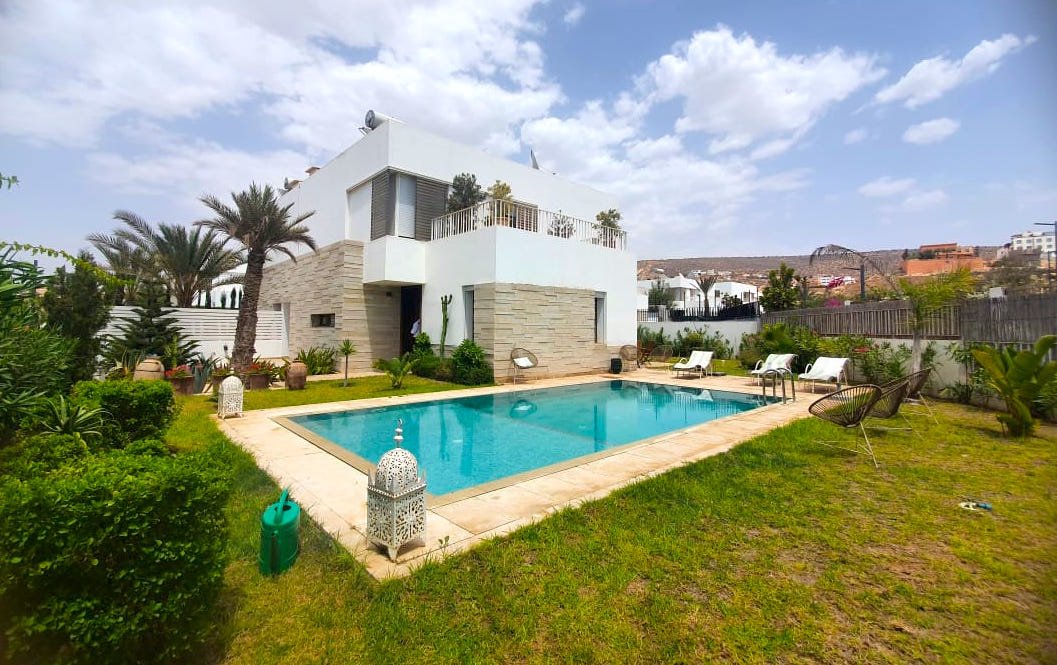Très Jolie Villa indépendante style moderne à louer vide de 400m² de terrain, avec terrasse, beau jardin et piscine privative sans vis à vis, bien située à Taghazout Bay à 15mn du centre ville d'Agadir. La villa est composée de 3 chambres à coucher dont une parentale avec sa salle de bain , 2éme SDB commune pour les 2 chambres, toilette visiteurs, une cuisine équipée et une réserve derière la cuisine, salle à manger, double salons pour la réception, tarrasse vue sur mer. Résidence sécurisée en front de mer à Taghazout Bay avec Golf et divers esapaces verts. Loyer: 19.000 dh Hors Charges