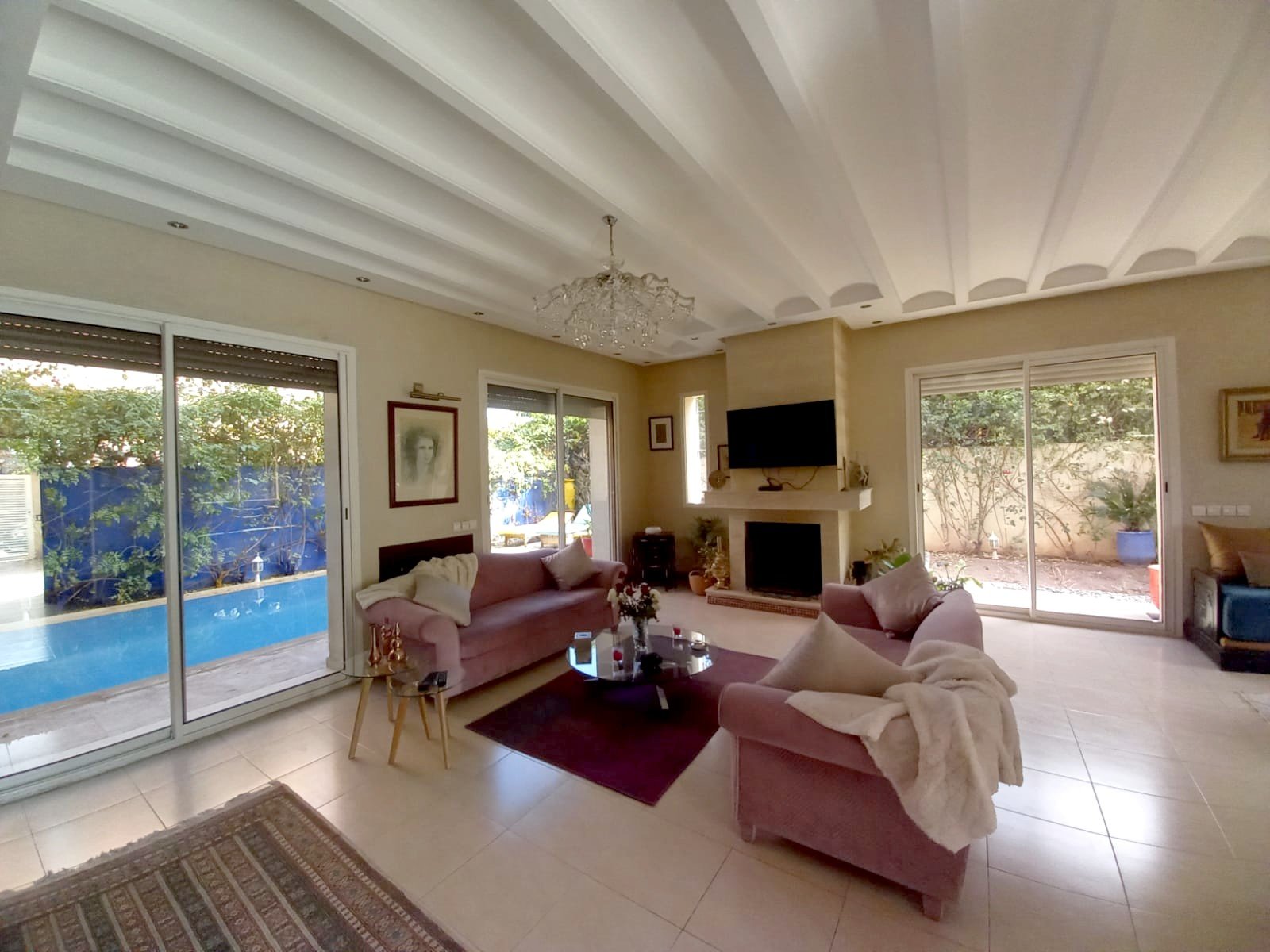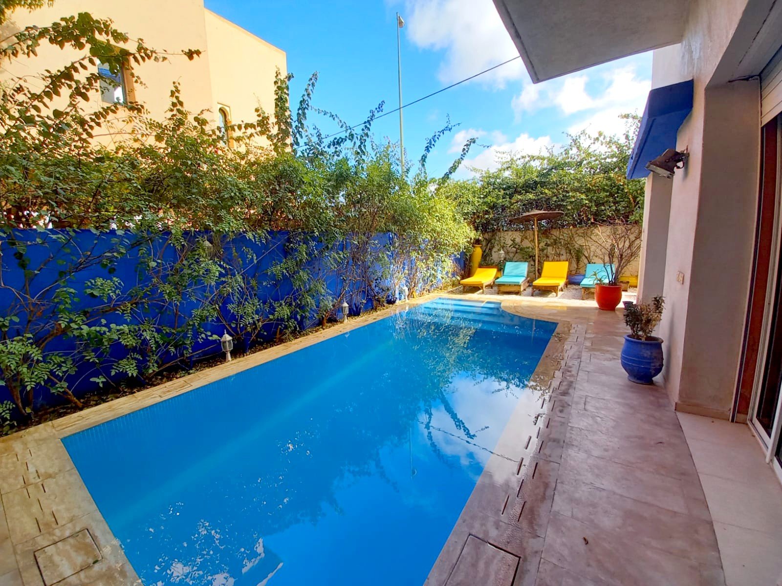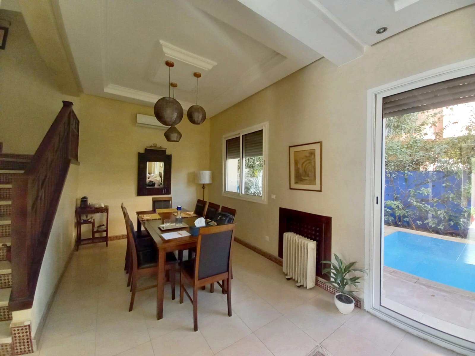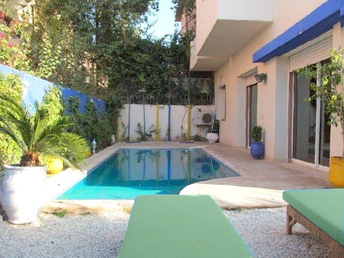 Une belle villa refaite à neuf à louer meublée avec piscine privative, bien située dans un secteur très calme et bien sécurisé à Targa pas loin de l'école des orangers. Composée au: RDC: réception 1 salon marocain moderne , 1 salon avec cheminée - une cuisine, - toilettes visiteurs, À L'étage: - 3 chambres avec salles de bain , balcon Au sous sol : 2 chambres, 1 SDB avec une douche. Beau jardin et une jolie piscine privative Chauffage central; un chauffe-eau solaire et une grande terrasse.