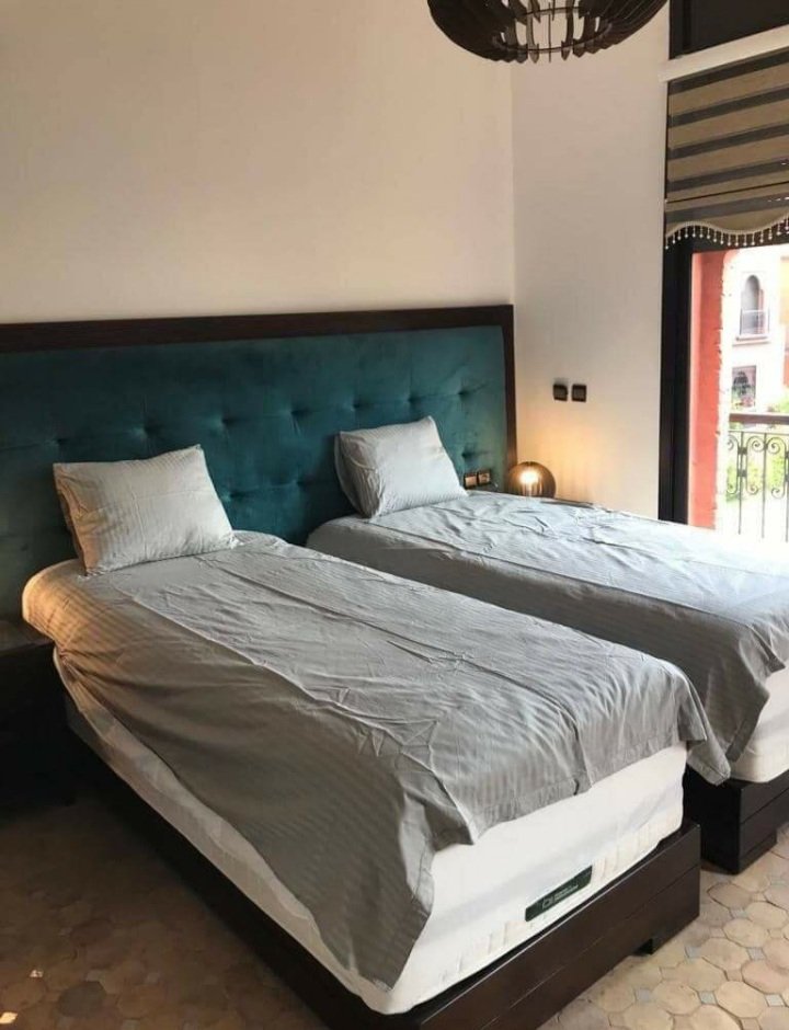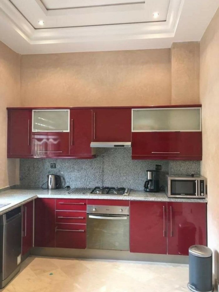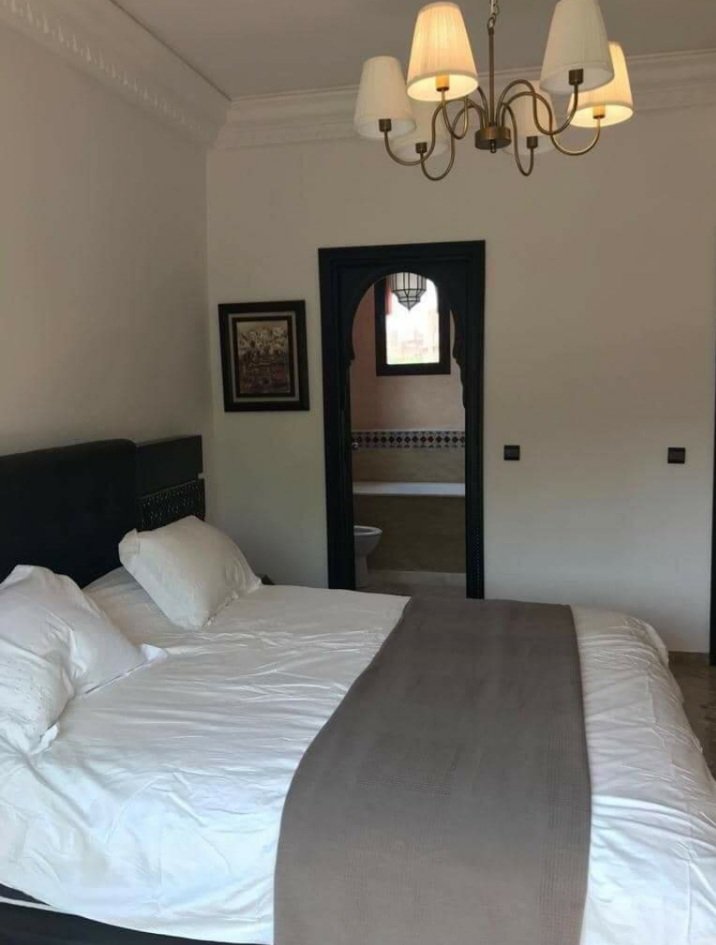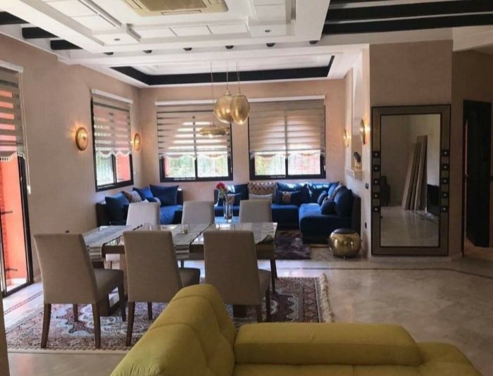 À 5 min du centre commercial ATACADAO, et à proximité des Golfs ( Amelkis, al maaden, et royal golf ) , une jolie villa de 320 m² Bien meublée en location longue durée composée de : RDC: salon marocain, coin salle a manger et coin cheminée, vestiaire invités et cuisine équipée avec une terrasse. Plus une autre terrasse qui donne sur le salon. Petit jardin bien entretenu et une jolie piscine privative pour se rafraichir durant les longs mois chauds de Marrakech. 1er etage : 1 chambre parental avec salle de bain et 2 chambres avec une deuxième salle de bain Terrasse avec vue Atlas . la villa est située dans une résidence sécurisée 24/24 et qui dispose d'un service de conciergerie, des beaux espaces verts une piscine collective, terrains de jeux, terrains de foot et salle de sport. très bien située sur la route de fes proche de l’École américaine .