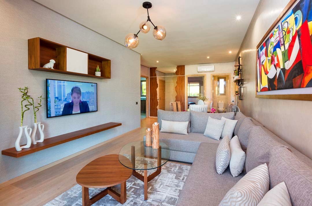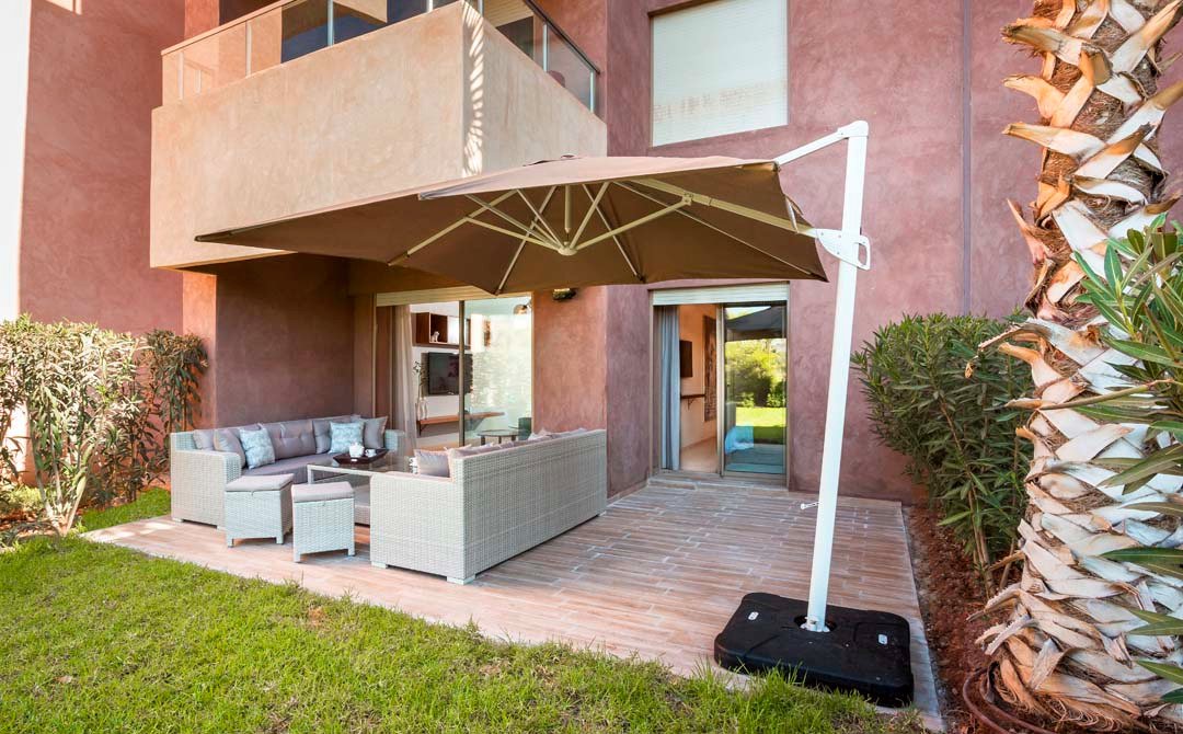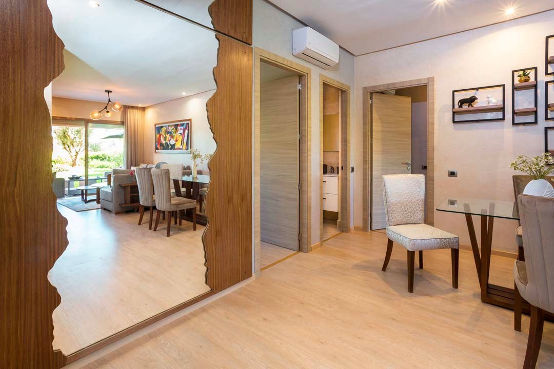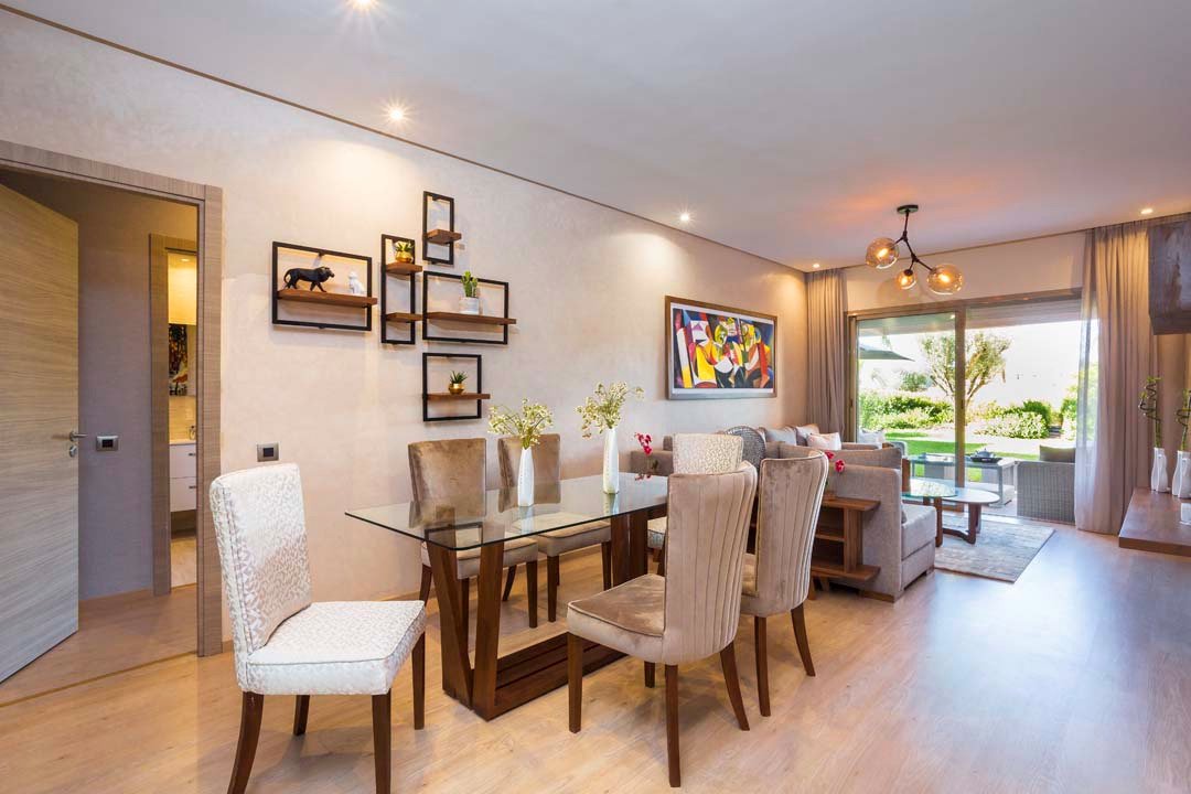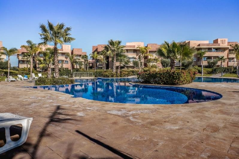 Nous vous offrons en location longue durée, ce magnifique appartement d'une superficie de 160m², au Rez de jardin, composé de 2 chambres avec placards dont une parentale avec sa sdb, une 2ème sdb, un salon moderne avec accès direct au jardin, un coin table à manger, une cuisine équipée, l'appartement est parfaitement équipé neuf avec une jolie décoration, disposant d'un jardin privatif et une belle terrasse, piscine collective au Prestigia golf resort. Loyer: 11.000 dh CHARGES DE COPROPRIÉTÉS COMPRISES