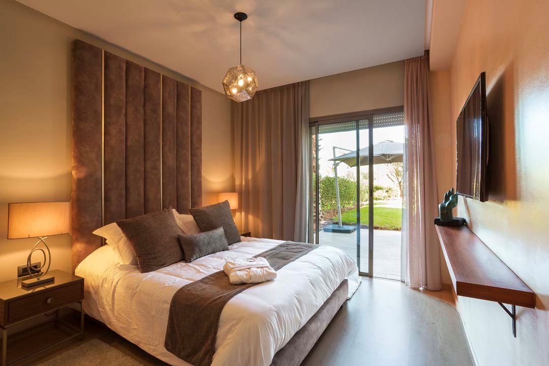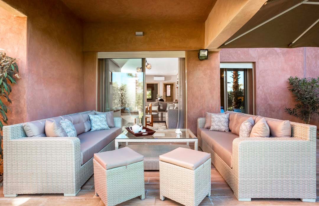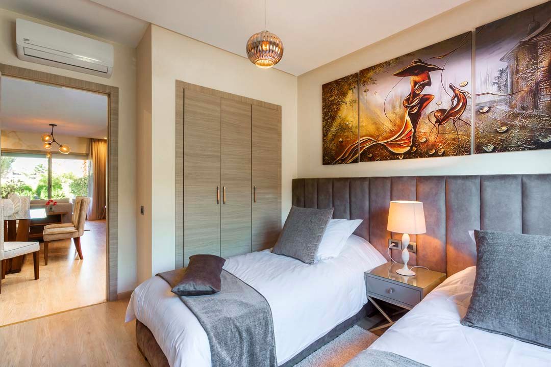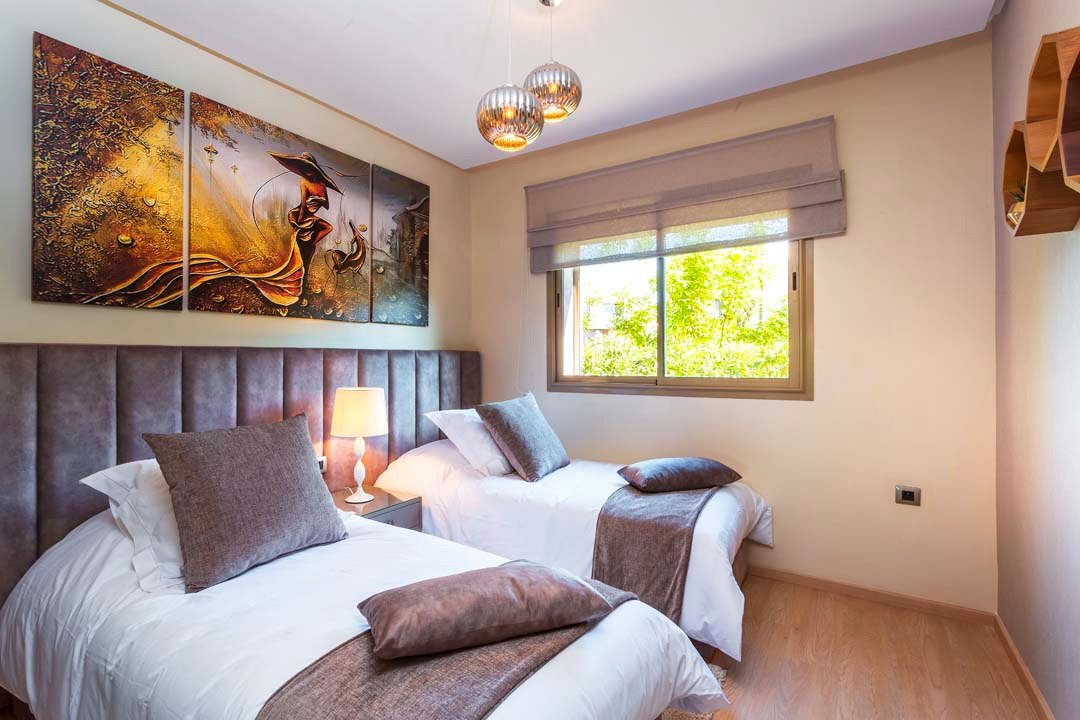 Nous vous offrons en location longue durée, ce magnifique appartement d'une superficie de 160m², au Rez de jardin, composé de 2 chambres avec placards dont une parentale avec sa sdb, une 2ème sdb, un salon moderne avec accès direct au jardin, un coin table à manger, une cuisine équipée, l'appartement est parfaitement équipé neuf avec une jolie décoration, disposant d'un jardin privatif et une belle terrasse, piscine collective au Prestigia golf resort. Loyer: 11.000 dh CHARGES DE COPROPRIÉTÉS COMPRISES