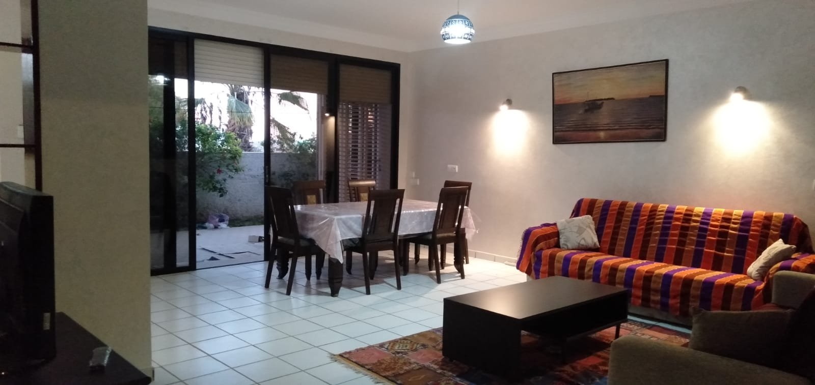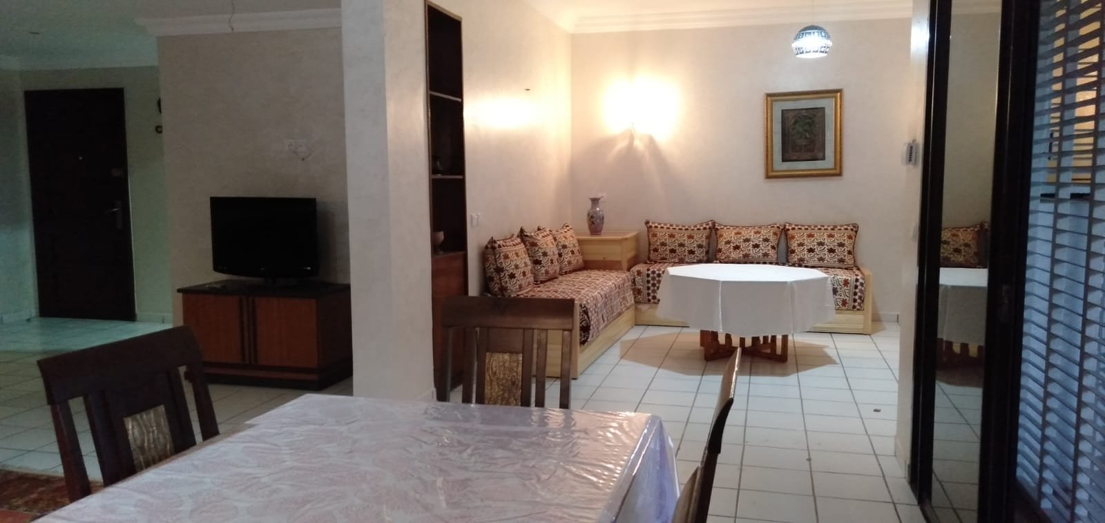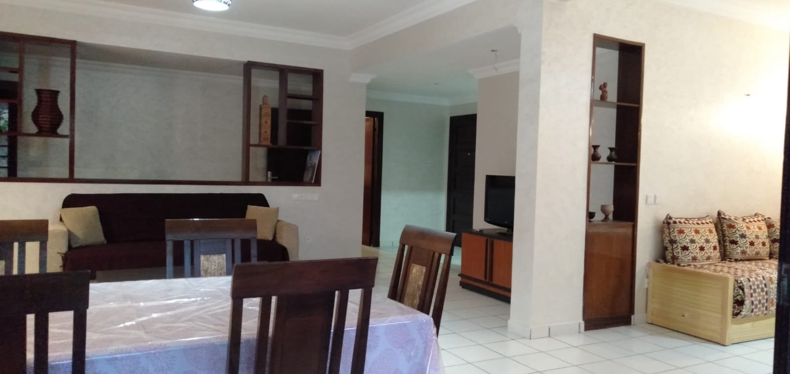 A louer en location longue durée un grand appartement familal, meublé,d'une superficie de 260m2 bien ensoleillé avec 2 façades, composé d'un double salon avec baie vitrée donnant à la terrasse et jardin, une chambre parentale avec dressing et salle de bain avec baignoire,2 chambres avec baie vitrée sur terrasse avec jardin,1 grande cuisine avec placards et placard mural, 1 pièce de rangement, une salle de bain avec baignoire, 1WC avec lavabo et 2 terrasses avec 2 jardins sur les 2 façades. Place de parking privée. L'appartement est situé au Rdc d'une résidence sécurisée 24/24, très bien située à 2 pas de la plage, à proximité du centre ville. Loyer: 9000 dh CC