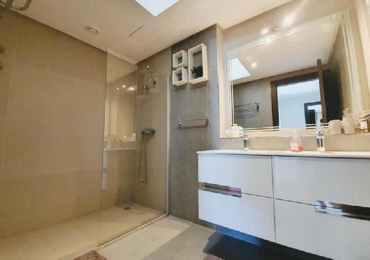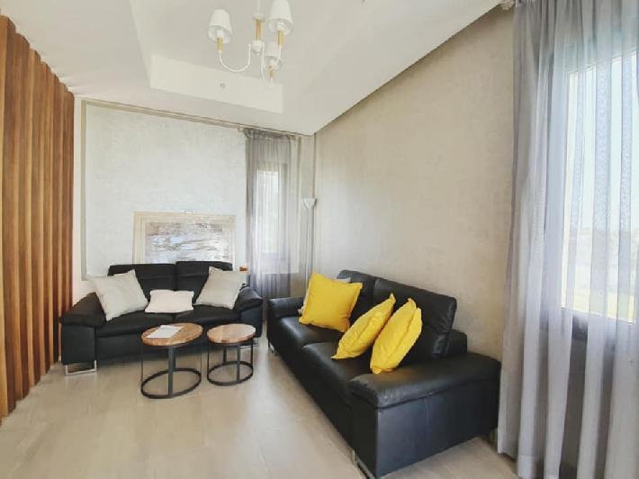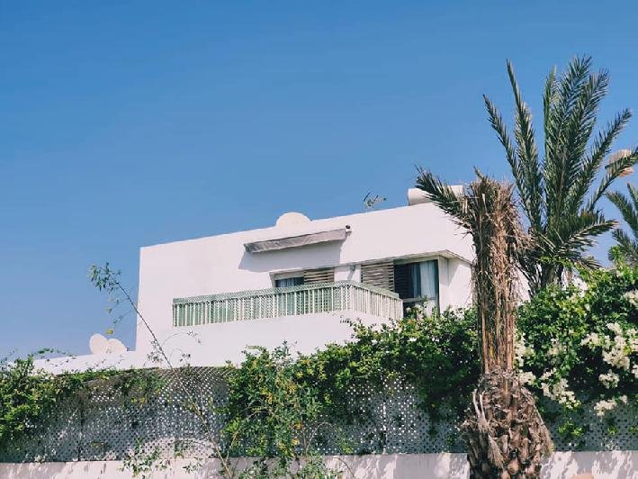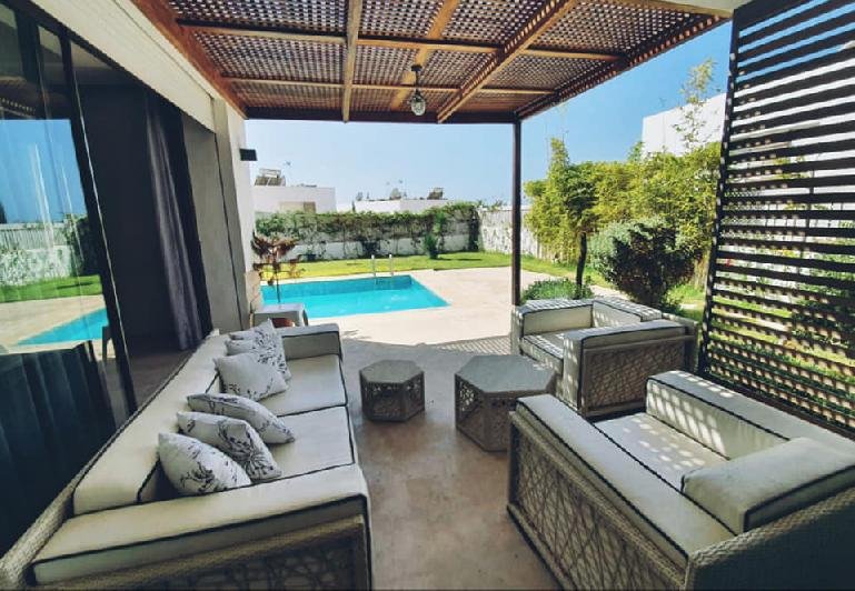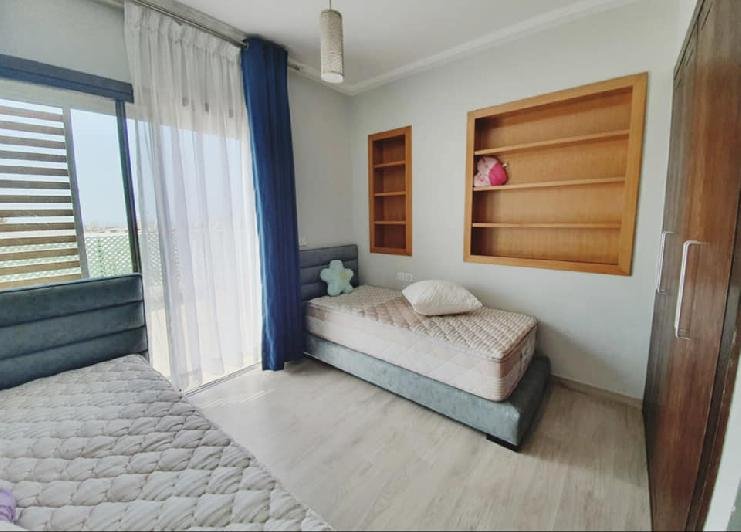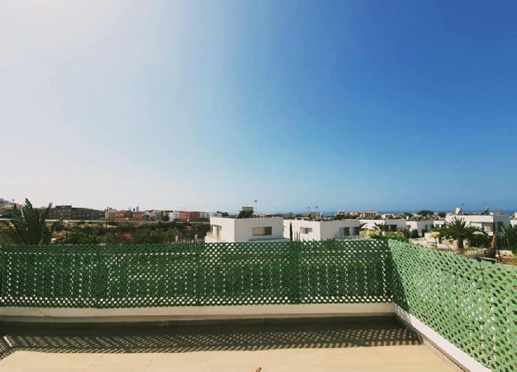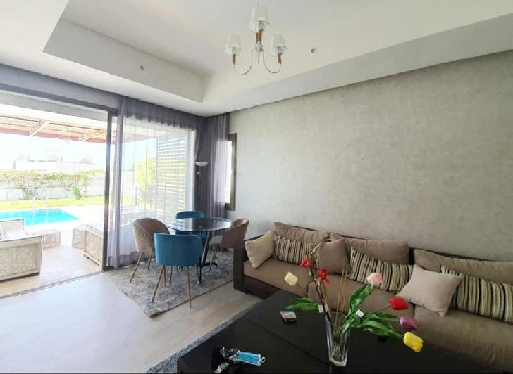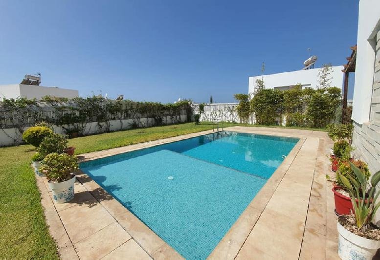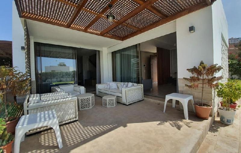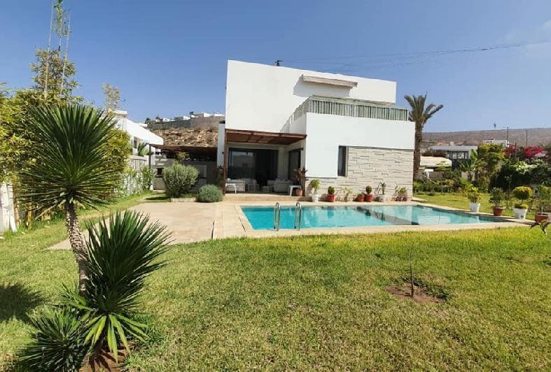 À vendre ou à louer (longue durée meublée), cette très jolie villa de style moderne avec beau jardin et piscine privative au sein d'une résidence sécurisée et bien entretenue, dans la très prisée Taghazouat Bay à 15mn du centre ville d'Agadir. Loyer (meublée pour longue durée): 25.000 Dh (charges de syndic comprises) Prix de vente : 4.650.000 MAD La villa est construite sur 520m2 de terrain. Elle se compose de: RDC: double salon avec coin télé, toilette visiteurs, cuisine équipée donnant sur la chambre du personnel avec leur toilette. Et sur le jardin. Une jolie pergola face à la piscine au milieu du jardin sans vis-à-vis, avec un coin barbecue et un débarras. À l'étage : une chambre parentale avec sa sdb (baignoire) et son dressing. 2 autres chambres, une grande terrasse avec magnifique vue sur la mer et le village de Tamraght, une sdb (avec douche) et un wc. Une place de garage (auvent) pour 2 voitures. Résidence sécurisée à qq. pas de la plage, avec terrain de tennis, parc de jeux pur les enfants.