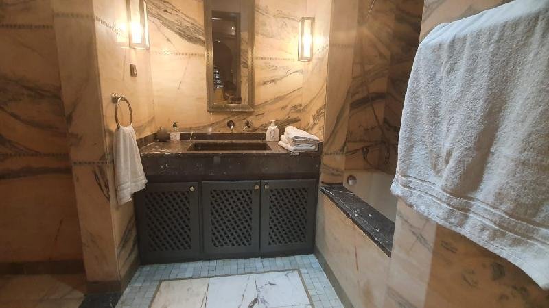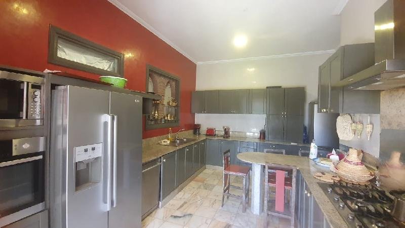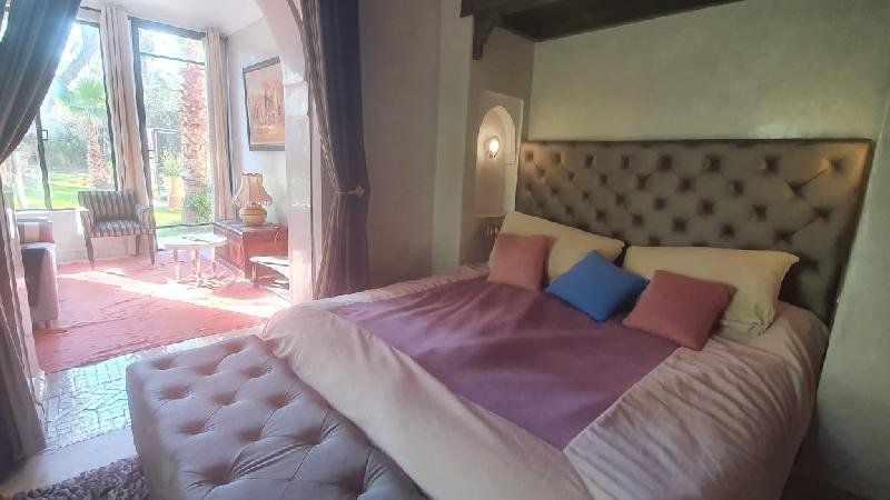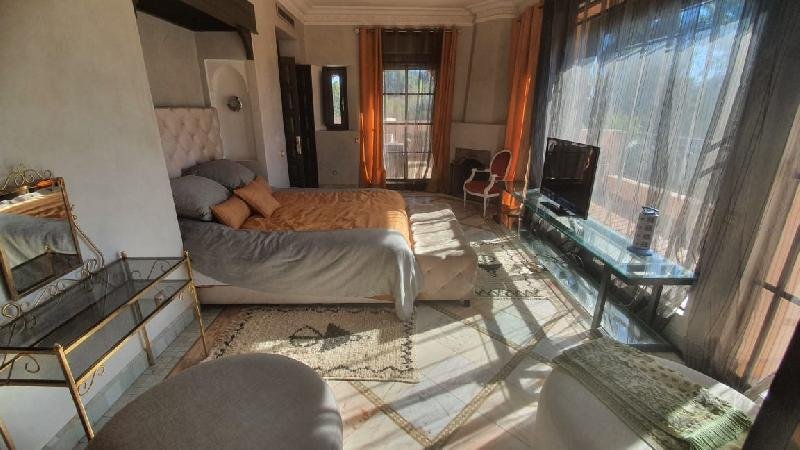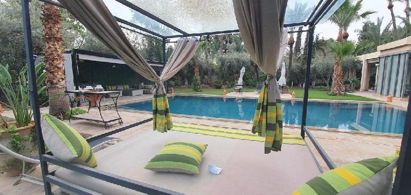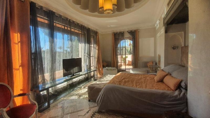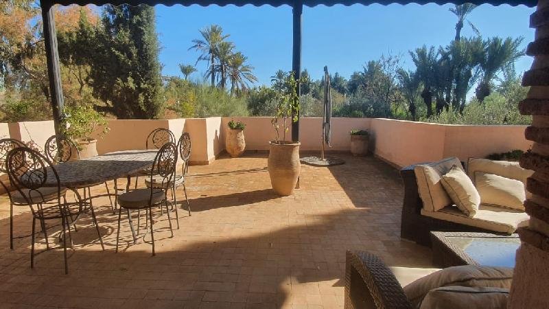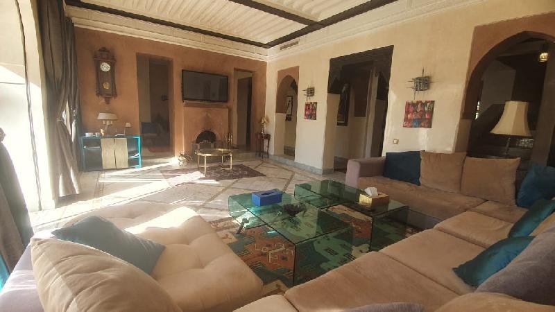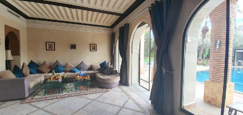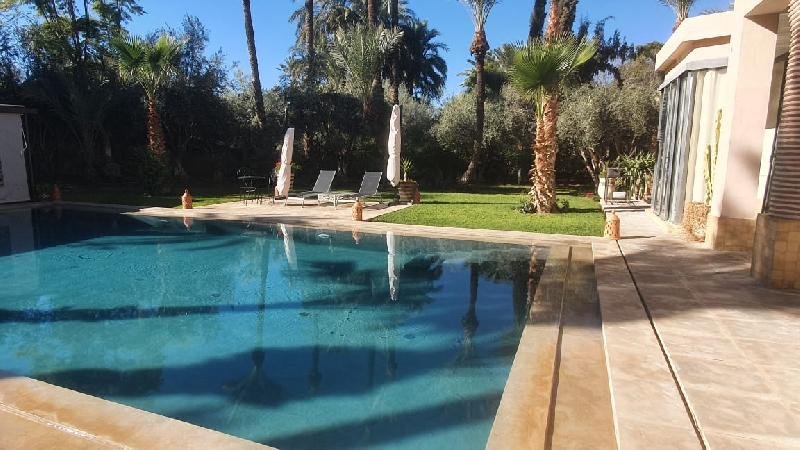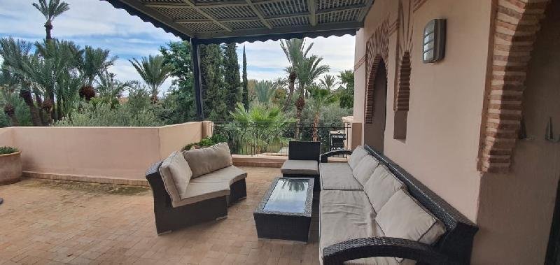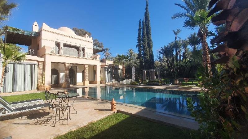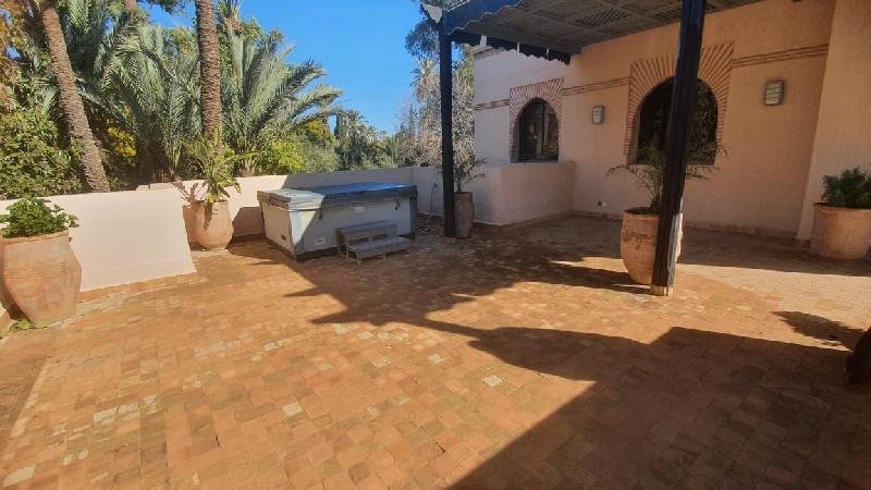 Dans la légendaire Palmeraie de Marrakech, à seulement 10 minutes estimées du centre de la nouvelle ville "Guéliz" et à peine à 5 minutes de toutes les commodités (Loisirs & Shopping), dans un domaine calme et sécurisé avec différentes parties communes, plusieurs piscines, salle de Gym, Parc de jeux pour enfants et Garderie, sur un terrain de 2000 m² avec piscine privative, ARTIMMO, votre agence immobilière à Marrakech vous suggère cette villa en location longue durée La propriété parfaitement meublée de 400 m² habitable comprend au Rez-de-chaussée : 2 salons avec cheminéeà double foyers, Grande cuisine entièrement équipée avec une buanderie extérieure, un coin salle à mange, des toilettes pour les invités, une chamnre pour le personnel, une terrasse donnant sur la piscine privative, en plus des 3 suites ( chaque chambre avec son petit salon, et sa salle de bain privée avec accès direct au jardin et à la piscine) . A l´étage de Cette Villa en location, vous trouverez une suite parentale qui occupe tout l'étage avec un grand dressing, un jacuzzi pour 4 personnes dans l'une des terrasses offrant une vue sur la piscine et le jardin. Une pergola, un coin bar et barbecue dans la piscine à débordements. 4 places de parking