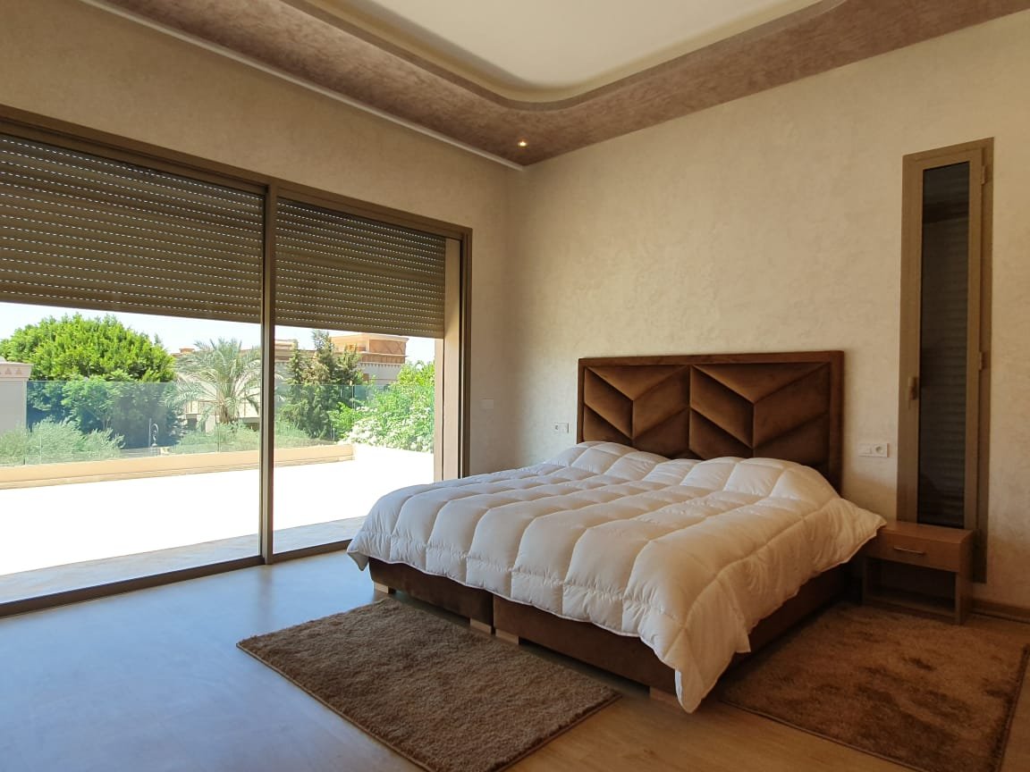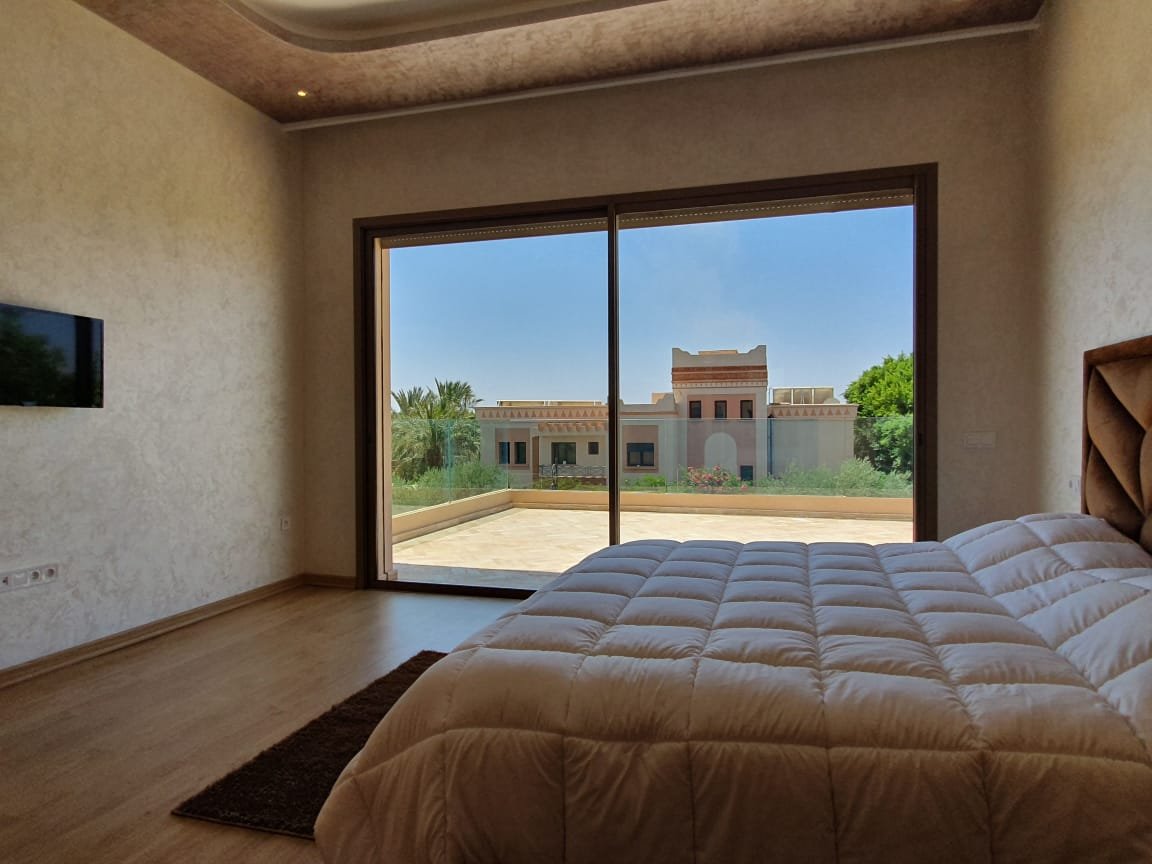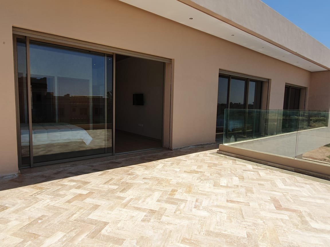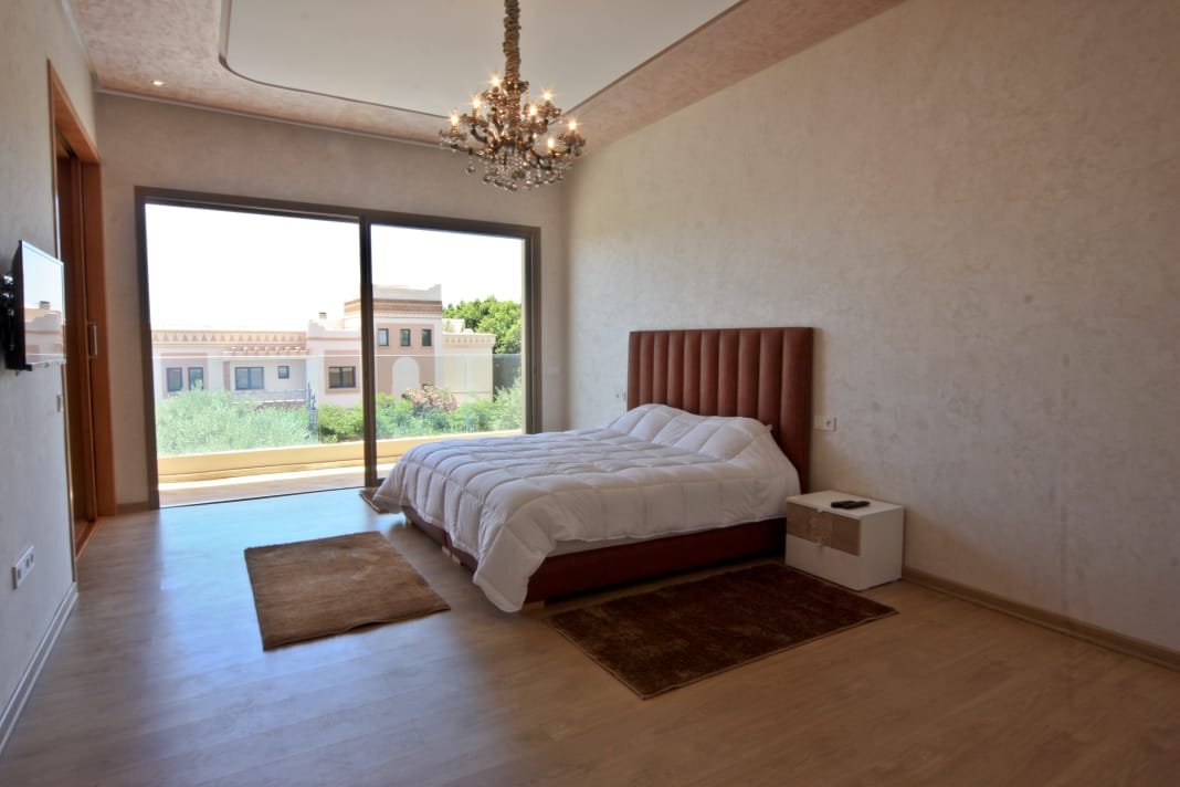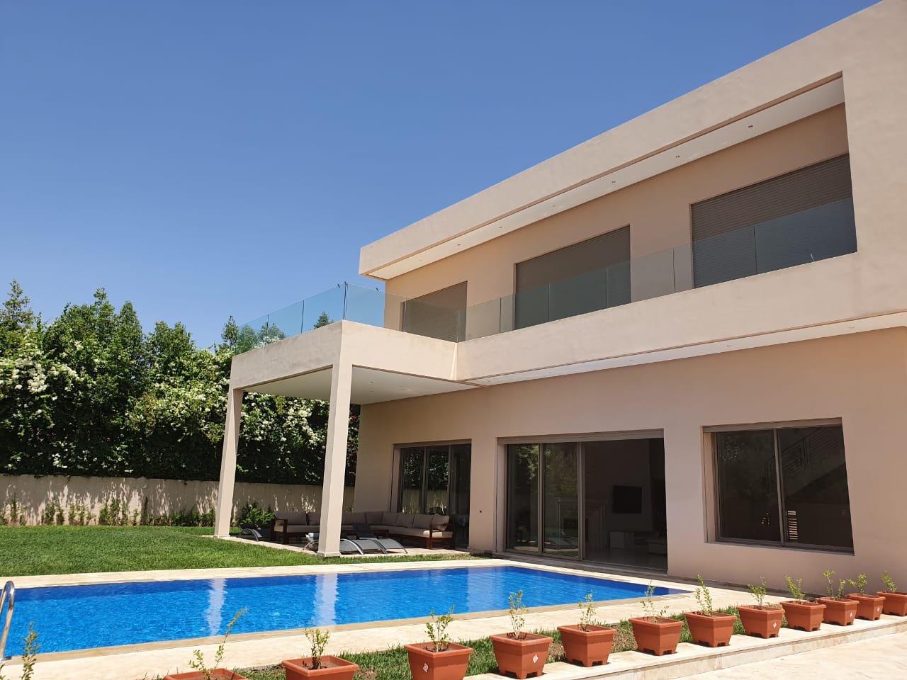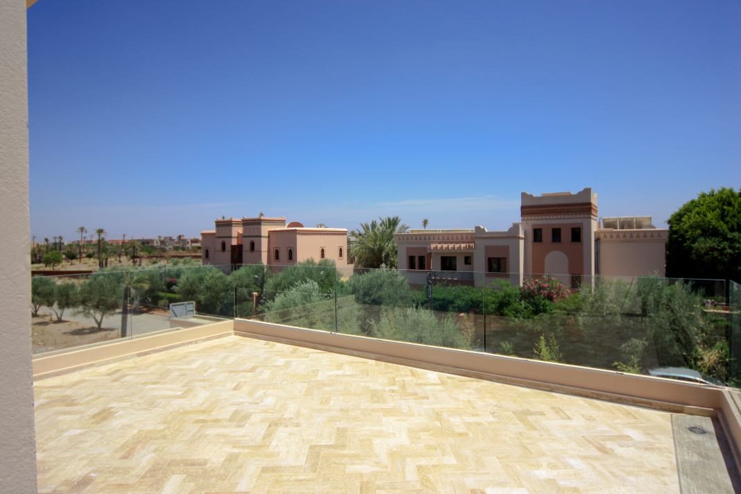 Villa située à proximité de 3 golfs: AMELKIS, du golf Royal et du golf MAADEN avec vues sur les montagnes de L'atlas, et les oliveraies autour, à environ 9 km du centre ville de Marrakech, sur un terrain de 1029 m² avec une surface HABITABLE de 700 m². Cette belle villa est composée : au rez-de-chaussée d'un double salon dont un avec cheminée , séjour, salle à manger, cuisine, salle d'eau, terrasse et d'une chambre avec SDB donnant sur le jardin. A l'étage 5 suites dont une avec une grande terrasse toutes avec sdb. Au sous- sol : une cour anglaise, chambre suite avec sdb , une chambre pour le personnel , une salle de sport, une salle d'eau et un Hammam chauffé au gaz (chaudière) avec espace de relaxation. Au jardin vous profitez d'une grande piscine( 5mx12m) . PRESTATIONS DE QUALITÉ SUPÉRIEURE: Étanchéité : protection chaleur et froid A base de matériaux liège : finition marbre Menuiserie bois massif cèdre de L'atlas menuiserie aluminium importée Climatisation gainable.