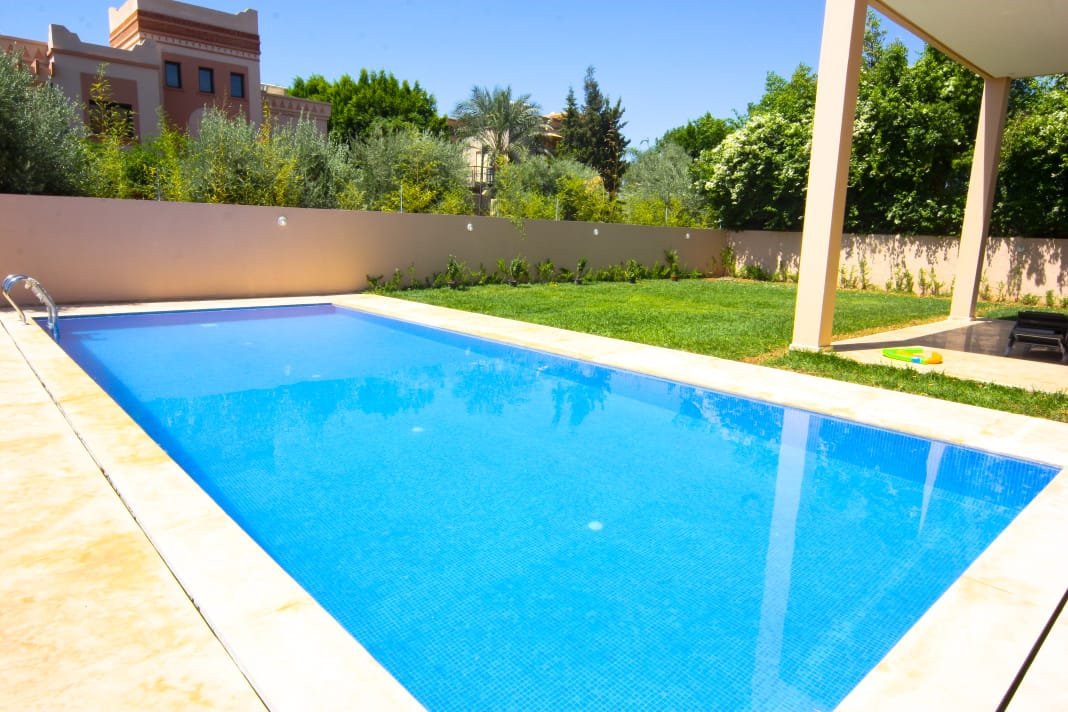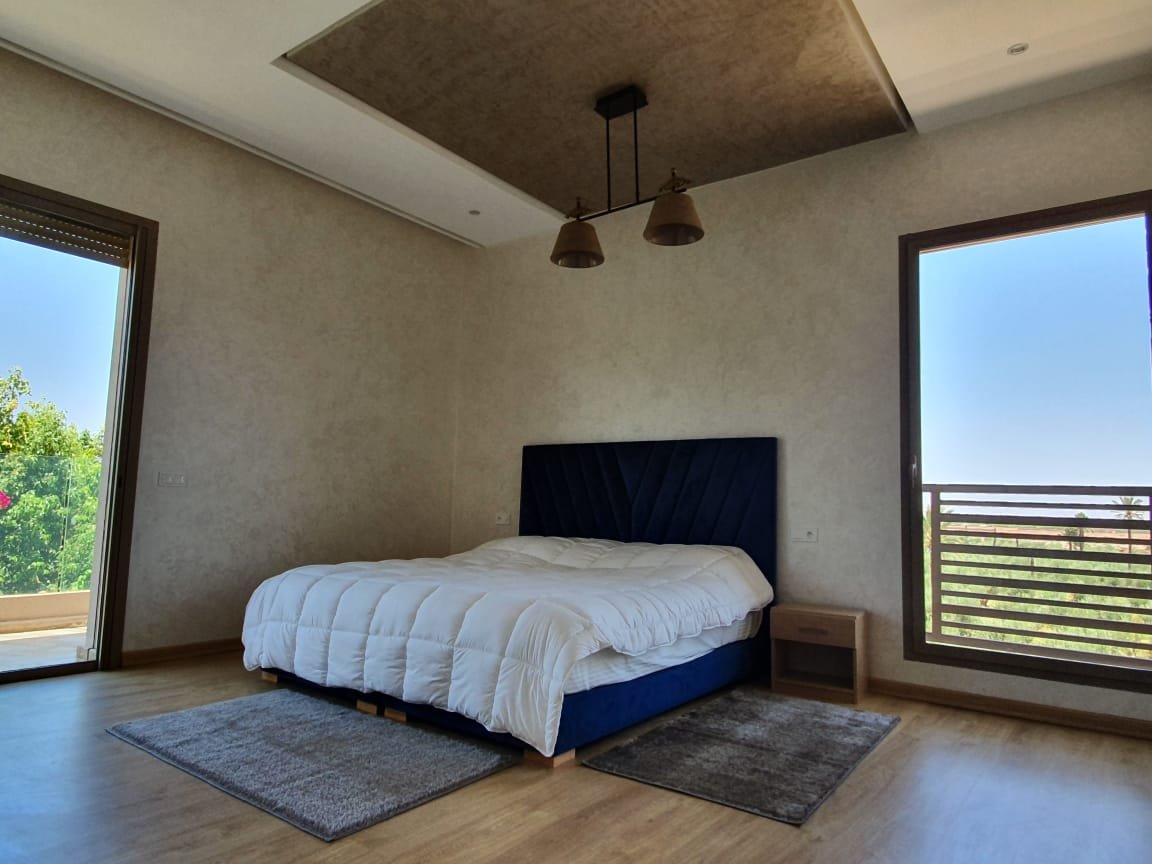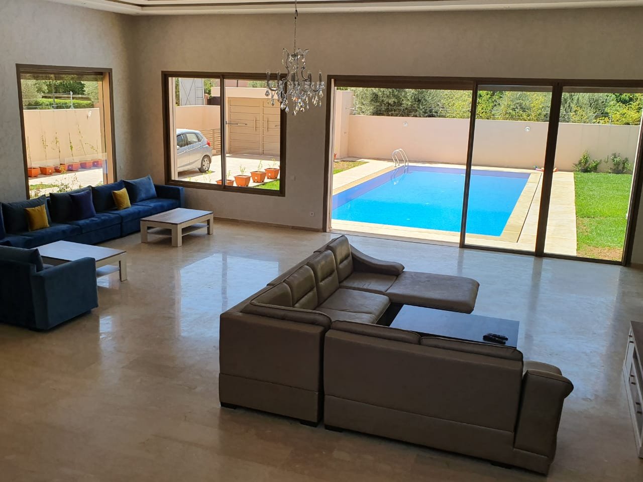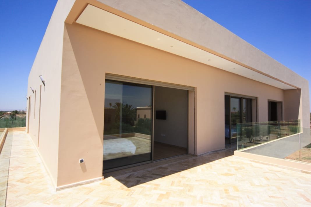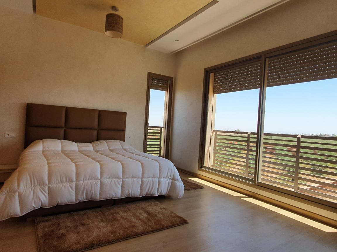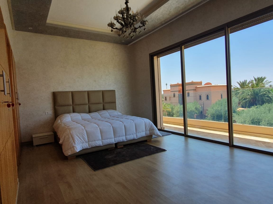Villa située à proximité de 3 golfs: AMELKIS, du golf Royal et du golf MAADEN avec vues sur les montagnes de L'atlas, et les oliveraies autour, à environ 9 km du centre ville de Marrakech, sur un terrain de 1029 m² avec une surface HABITABLE de 700 m². Cette belle villa est composée : au rez-de-chaussée d'un double salon dont un avec cheminée , séjour, salle à manger, cuisine, salle d'eau, terrasse et d'une chambre avec SDB donnant sur le jardin. A l'étage 5 suites dont une avec une grande terrasse toutes avec sdb. Au sous- sol : une cour anglaise, chambre suite avec sdb , une chambre pour le personnel , une salle de sport, une salle d'eau et un Hammam chauffé au gaz (chaudière) avec espace de relaxation. Au jardin vous profitez d'une grande piscine( 5mx12m) . PRESTATIONS DE QUALITÉ SUPÉRIEURE: Étanchéité : protection chaleur et froid A base de matériaux liège : finition marbre Menuiserie bois massif cèdre de L'atlas menuiserie aluminium importée Climatisation gainable.