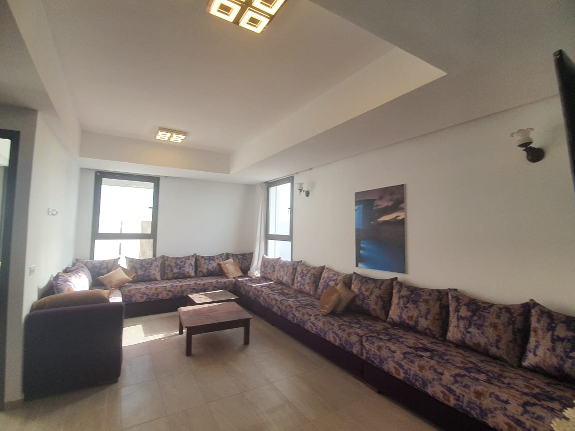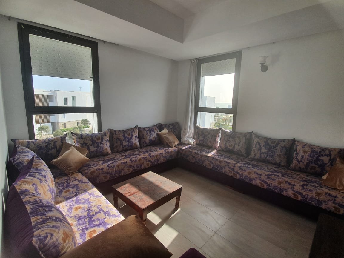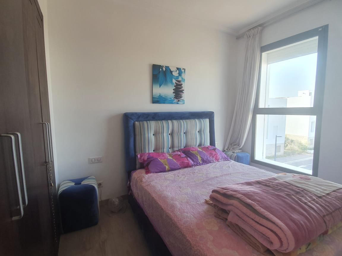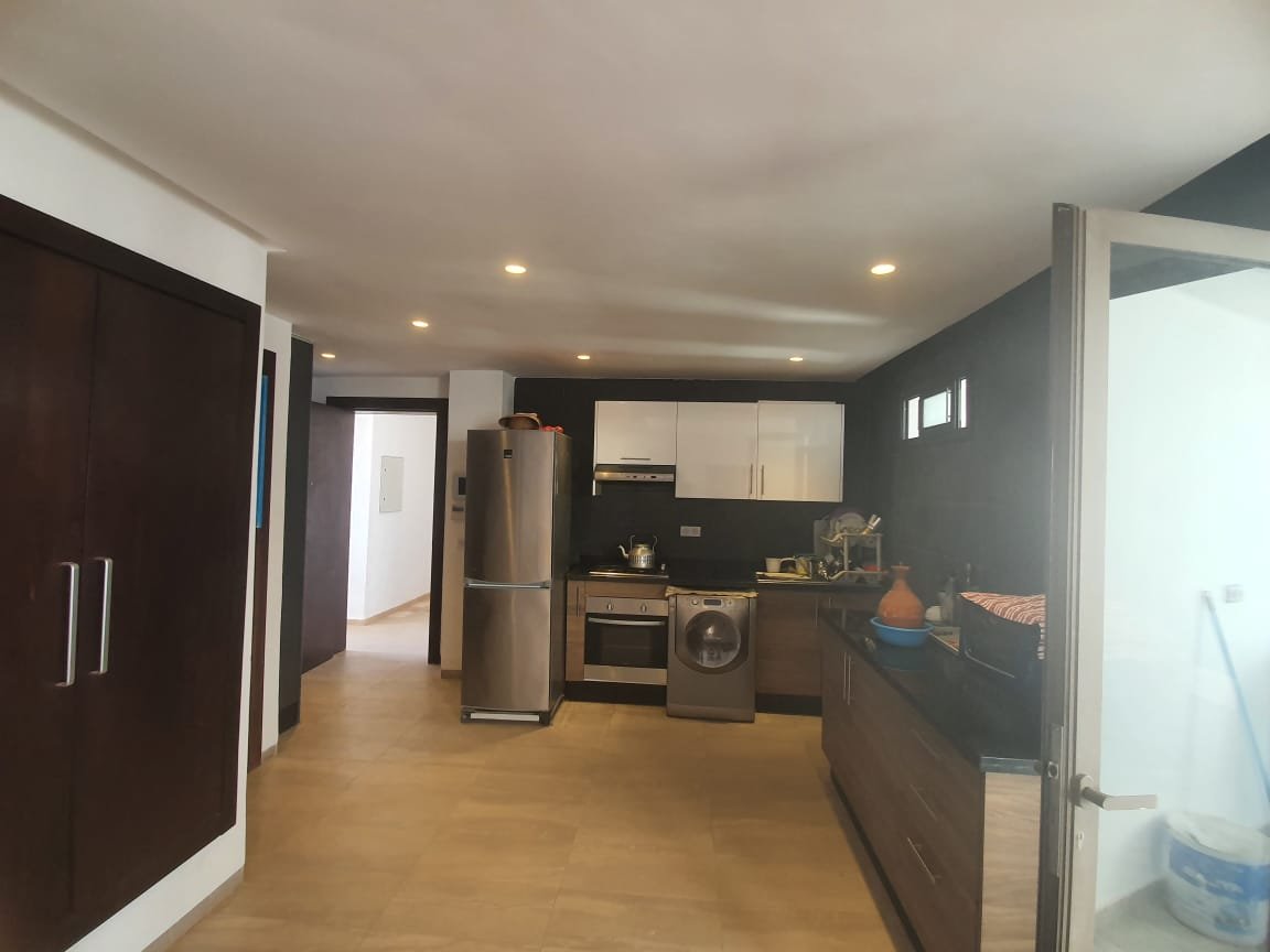 A louer en longue durée cet joli appartement, meublé et équipé à neuf style moderne, d'une superficie de 100m², lumineux et bien agencé, composé de 2 chambres dont une est convertible à un petit séjour, 1 SDB, une toilette visiteurs, une cuisine équipée, un salon moderne avec un coin salle à manger. L'appartement est situé dans une résidence fermée, sécurisée avec piscine à Taghazout Bay à qq. pas de la plage de sable doré, des hôtels de luxe et 15mn du centre ville
