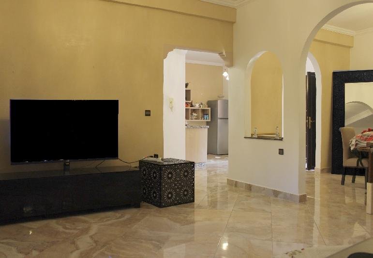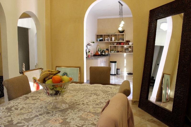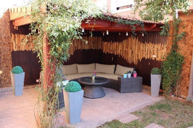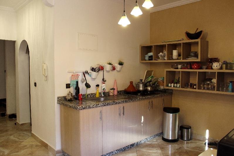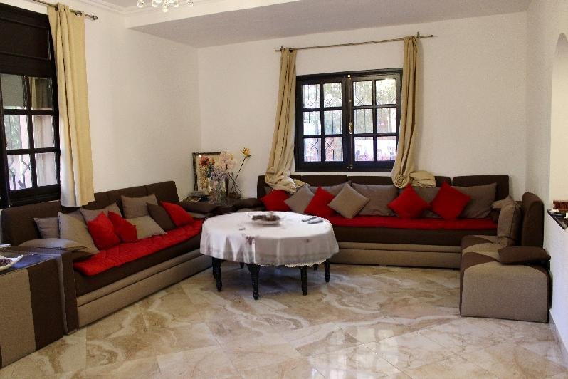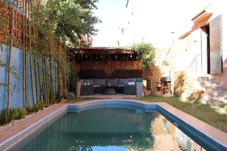 Tinass.Immo vous propose une belle villa meublée de 3 niveaux pour location longue durée d'une superficie de 300 m² composée au Rdc : - Salon , cuisine équipée , salle à manger , Wc invités , beau jardin , barbecue , une piscine et un garage . au 1ér étage : 3 chambres , salle de bain commune , une terrasse . au soul : 2 chambres , salle de bain , Wc , deuxième cuisine . le tout entouré par un joli jardin avec piscine , la villa est située dans un quartier calme et sécurisé 24/24 à Riad Salam proche de l'école IRAKI sur la route de casa à 5 minutes du Marjane .