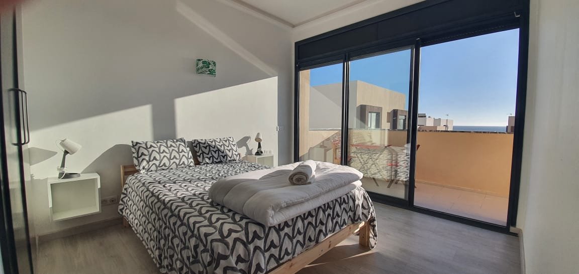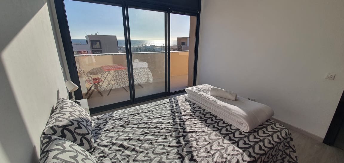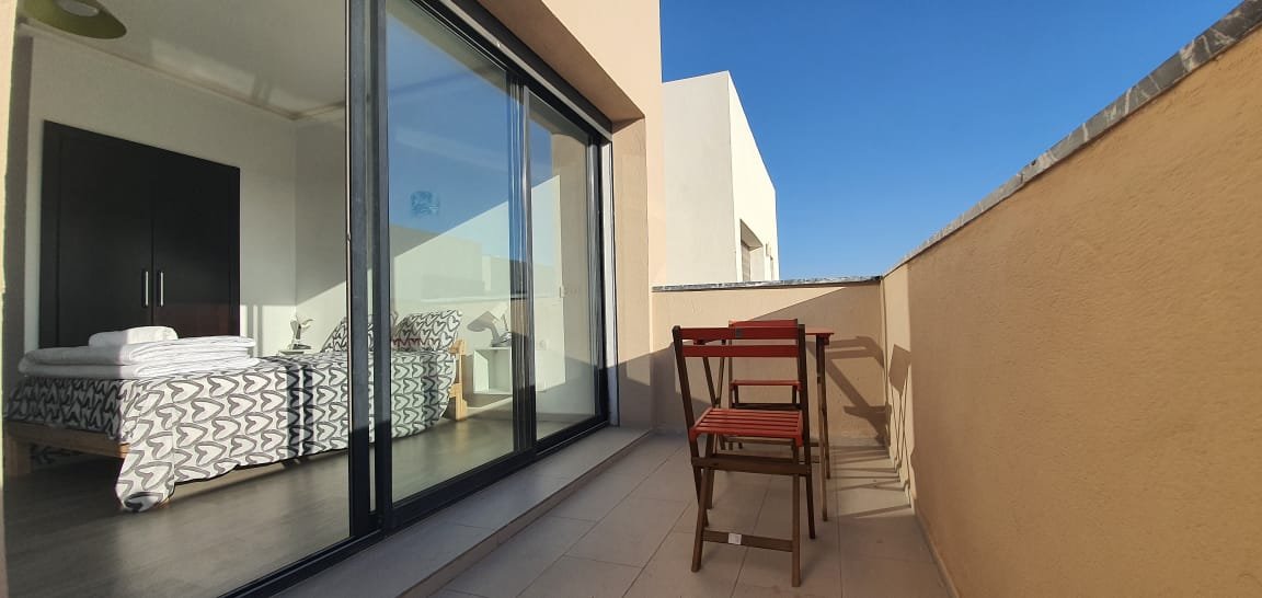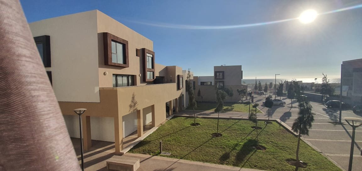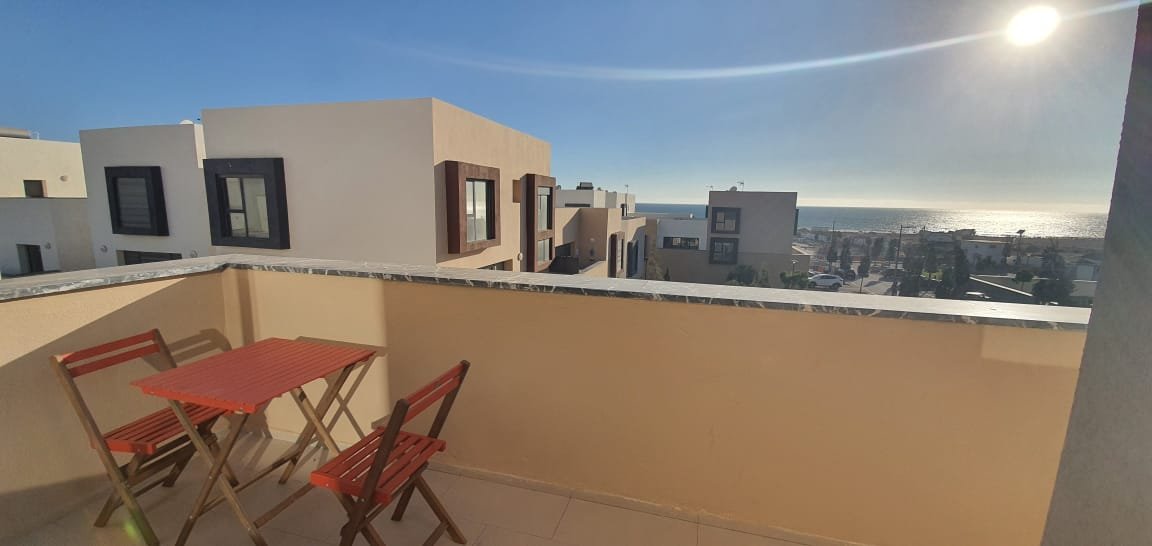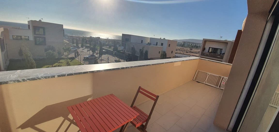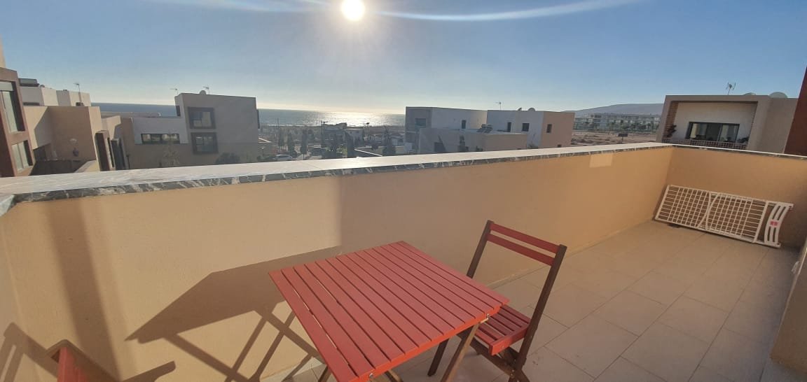 Beau Duplex à taghazout bay "Tawenza" vue sur mer et pieds dans l'eau en location longue durée, il se compose de: 2 grandes chambres, 2 SDB, Salon séjour, coin salle à manger, Cuisine équipée, Plusieurs balcons et terrasse, avec une piscine collective.