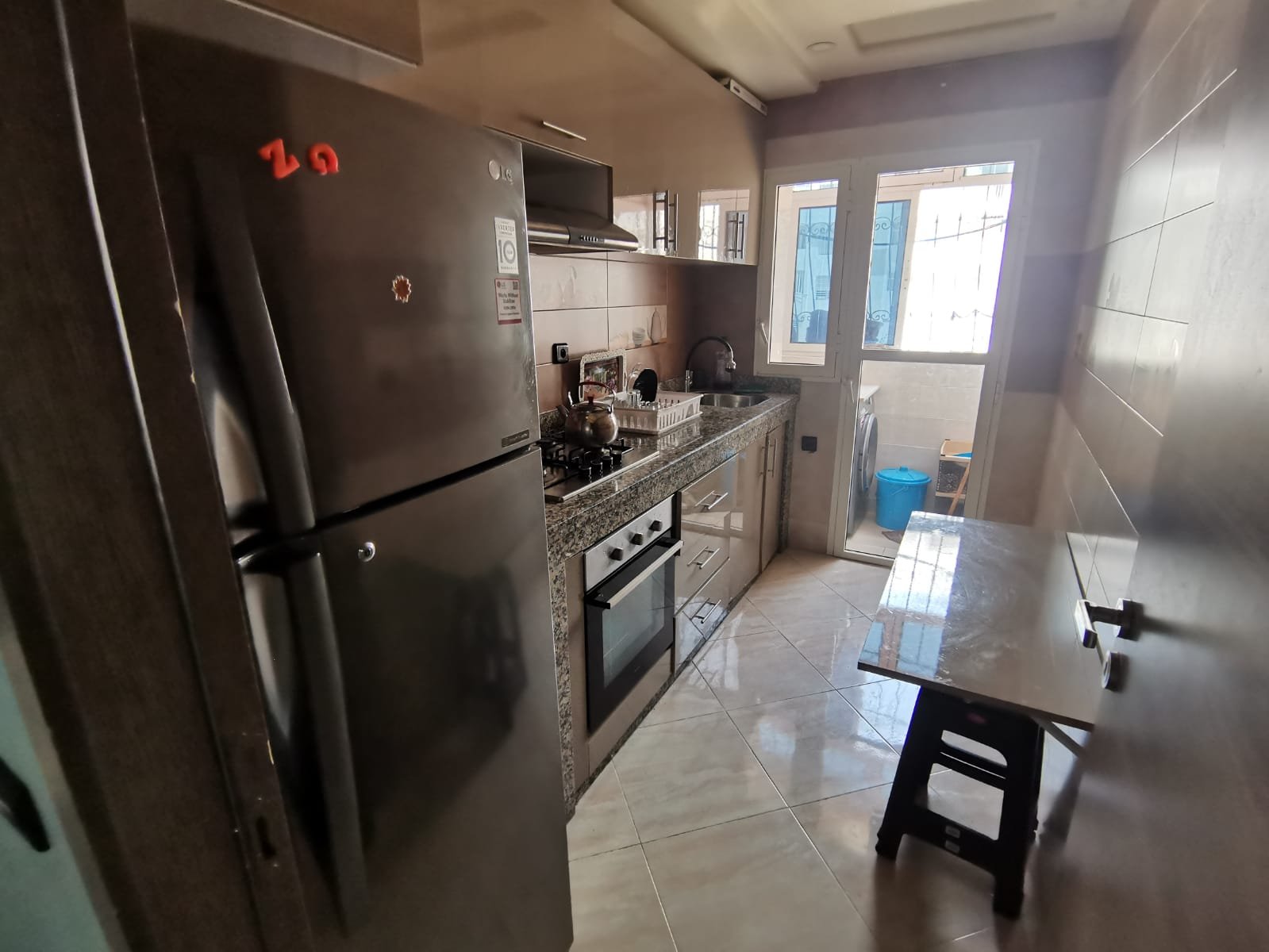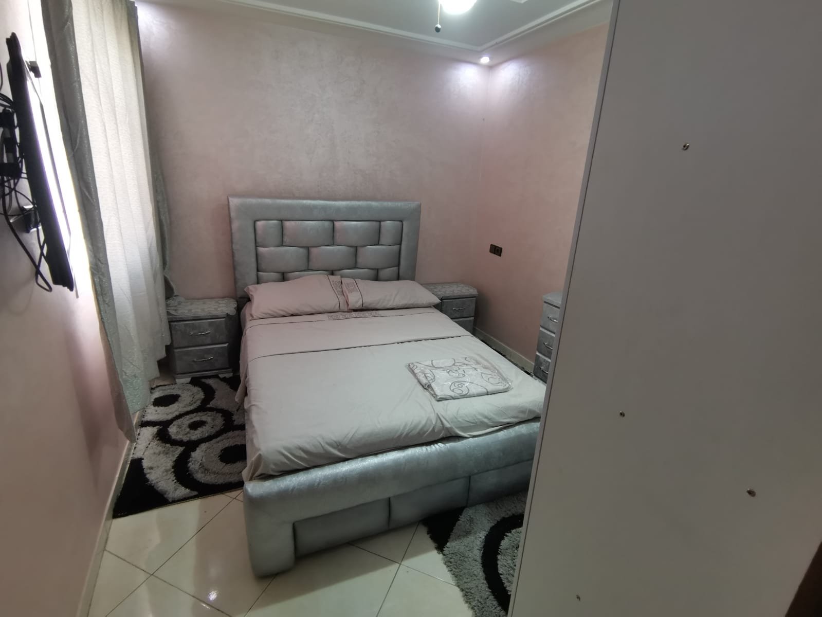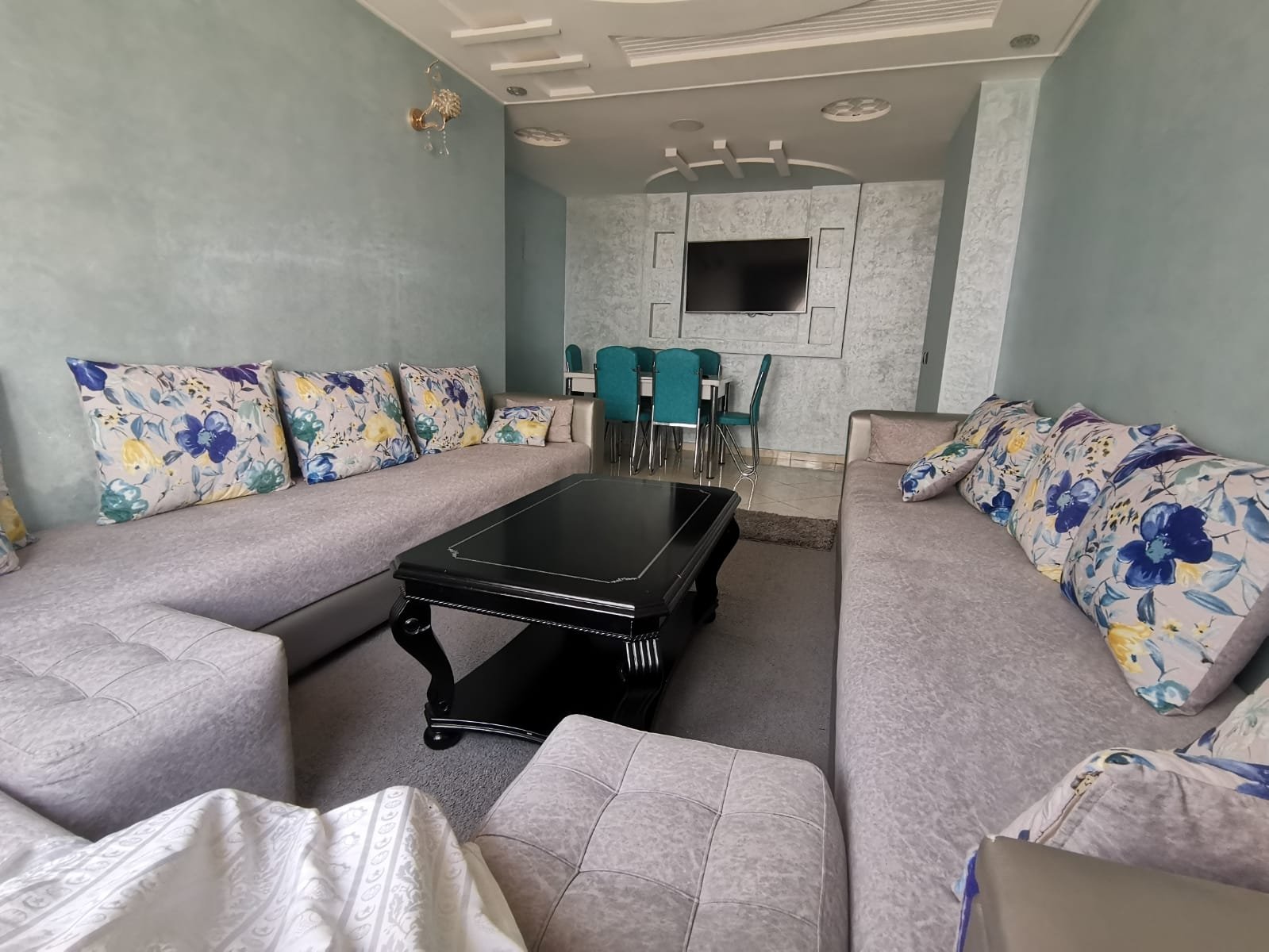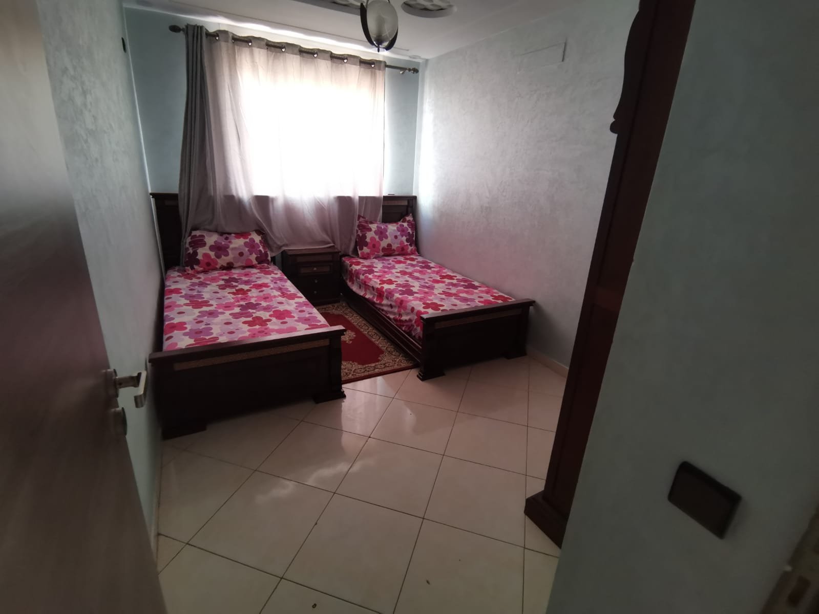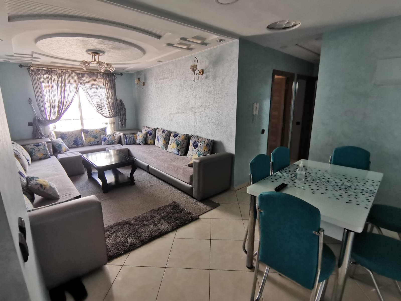 A louer en location longue durée, cet joli appartement entièrement rénové et meublé à neuf, composé de 2 chambres, 1 sdb avec douche, un salon moderne avec un coin salle à manger, un séjour, une cuisine équipée , une toilette invités, situé au 2ème étage, résidence avec piscine au quartier Hay Mohammadi.