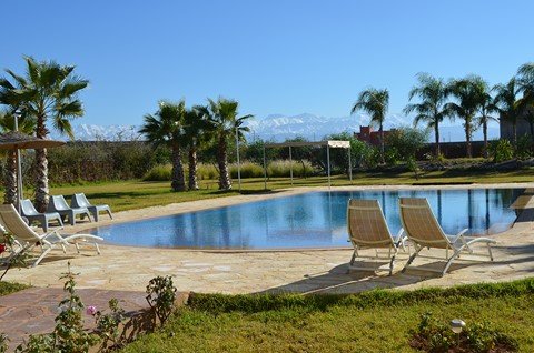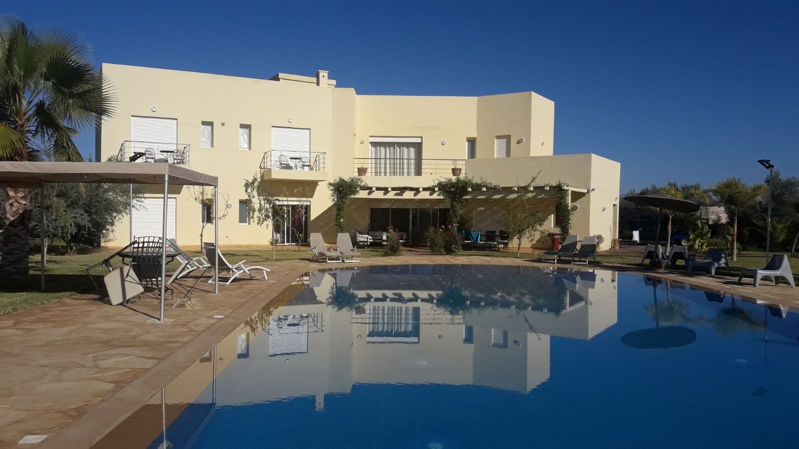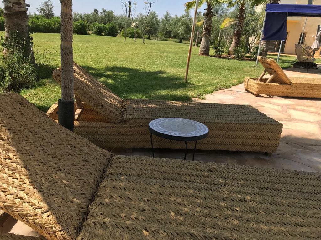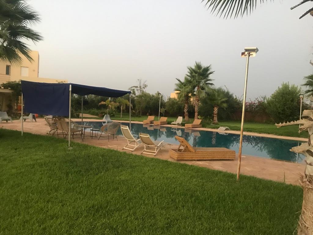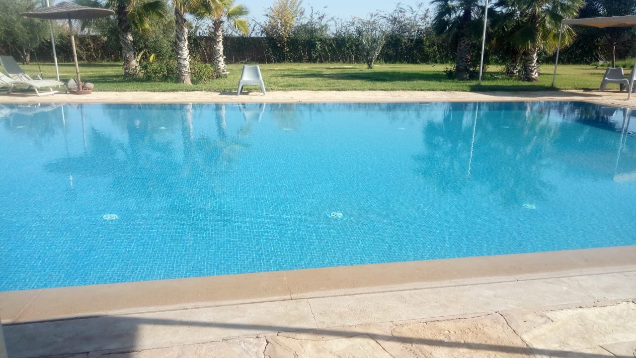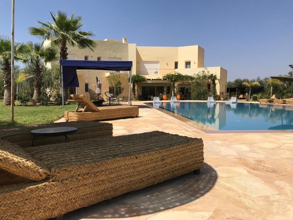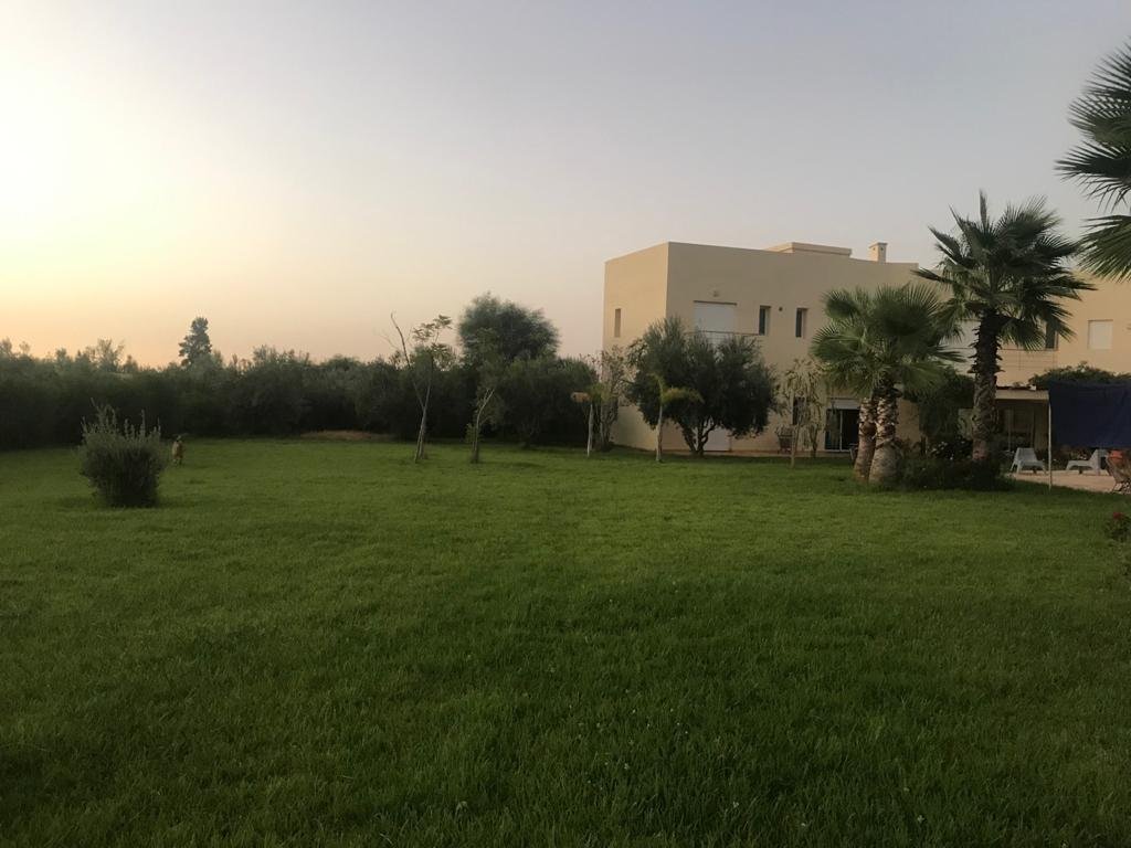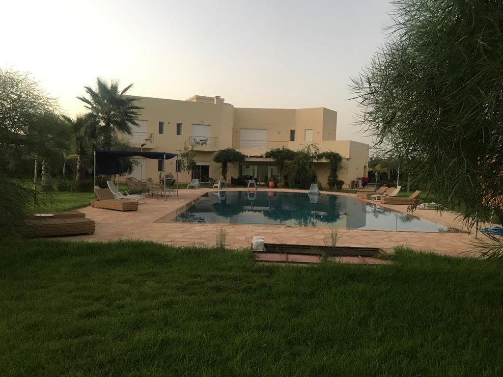 Belle Villa de style moderne, sur un beau jardin arboré;, à louer en longue durée au Km 10 route d'Ourika proche la plage rouge À Marrakech 5 suites, chacune a sa propre SDB, ses propres toilettes, sa propre clim réversible centralisée. Grand salon grande salle-a-manger et grande cuisine américaine. La villa est contemporaine, des grandes terrasses. Grande piscine 16x8 à débordement. Le tout est sur un 1 hectare payasagé NB: Il y a la fibre optique en plus