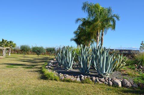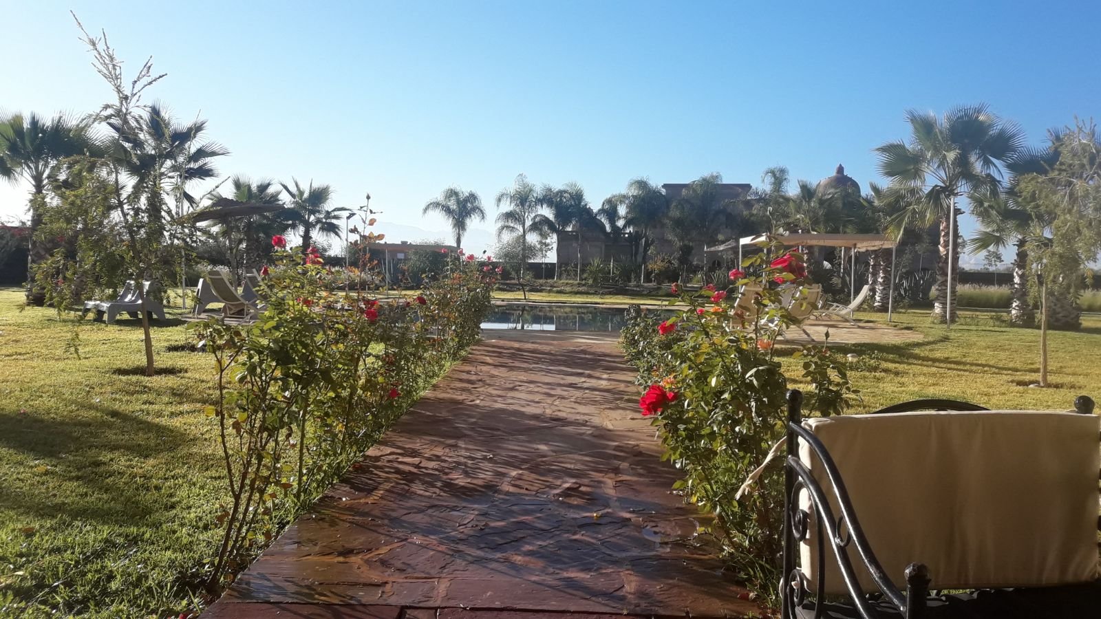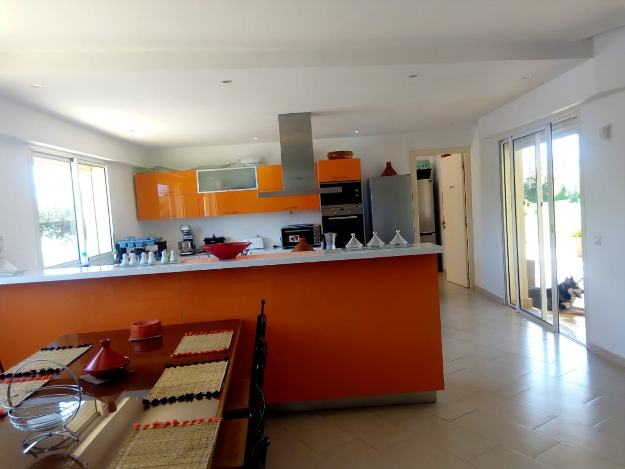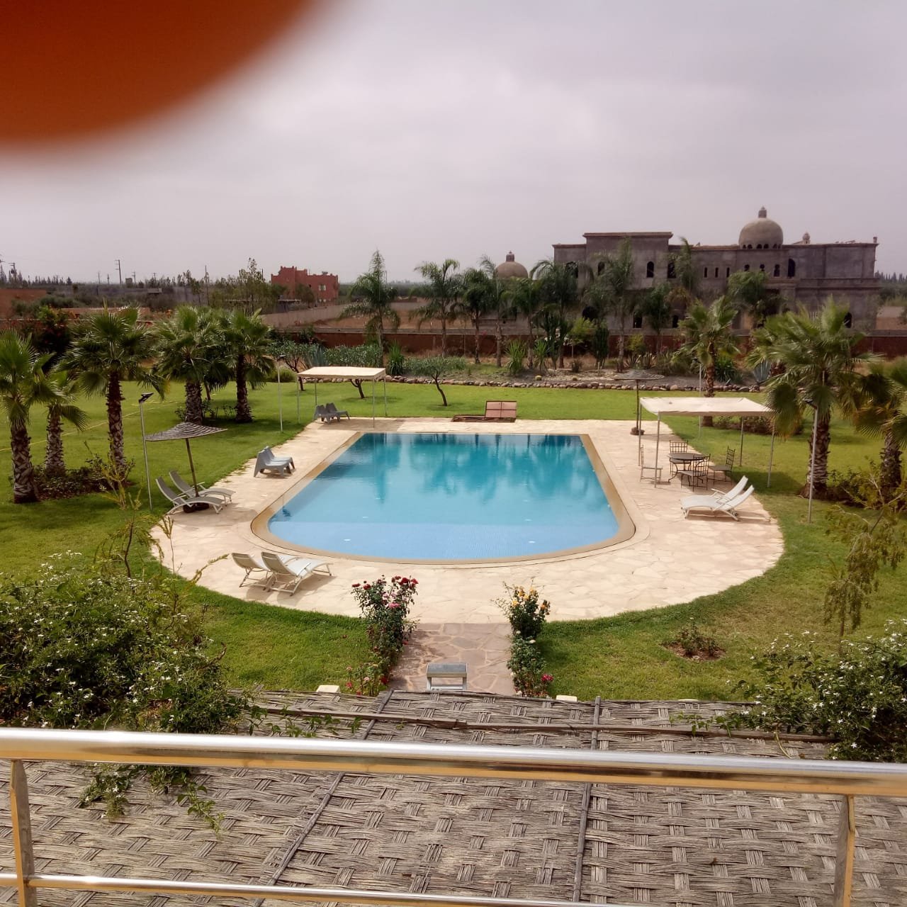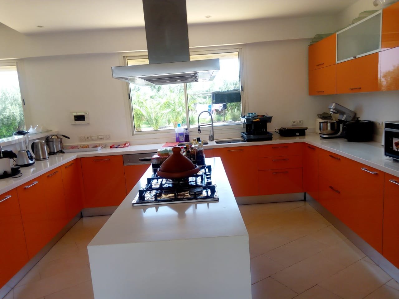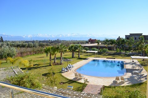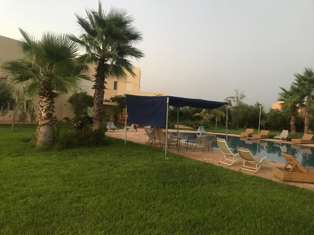 Belle Villa de style moderne, sur un beau jardin arboré;, à louer en longue durée au Km 10 route d'Ourika proche la plage rouge À Marrakech 5 suites, chacune a sa propre SDB, ses propres toilettes, sa propre clim réversible centralisée. Grand salon grande salle-a-manger et grande cuisine américaine. La villa est contemporaine, des grandes terrasses. Grande piscine 16x8 à débordement. Le tout est sur un 1 hectare payasagé NB: Il y a la fibre optique en plus