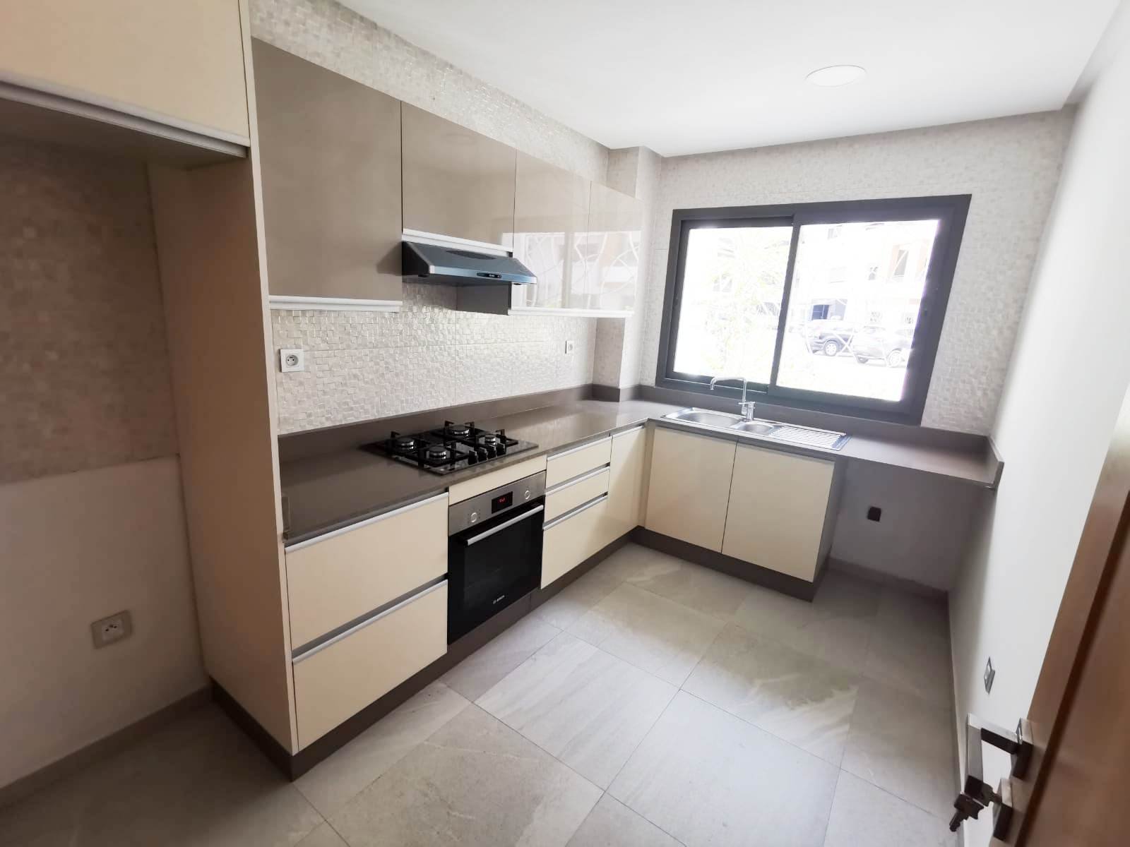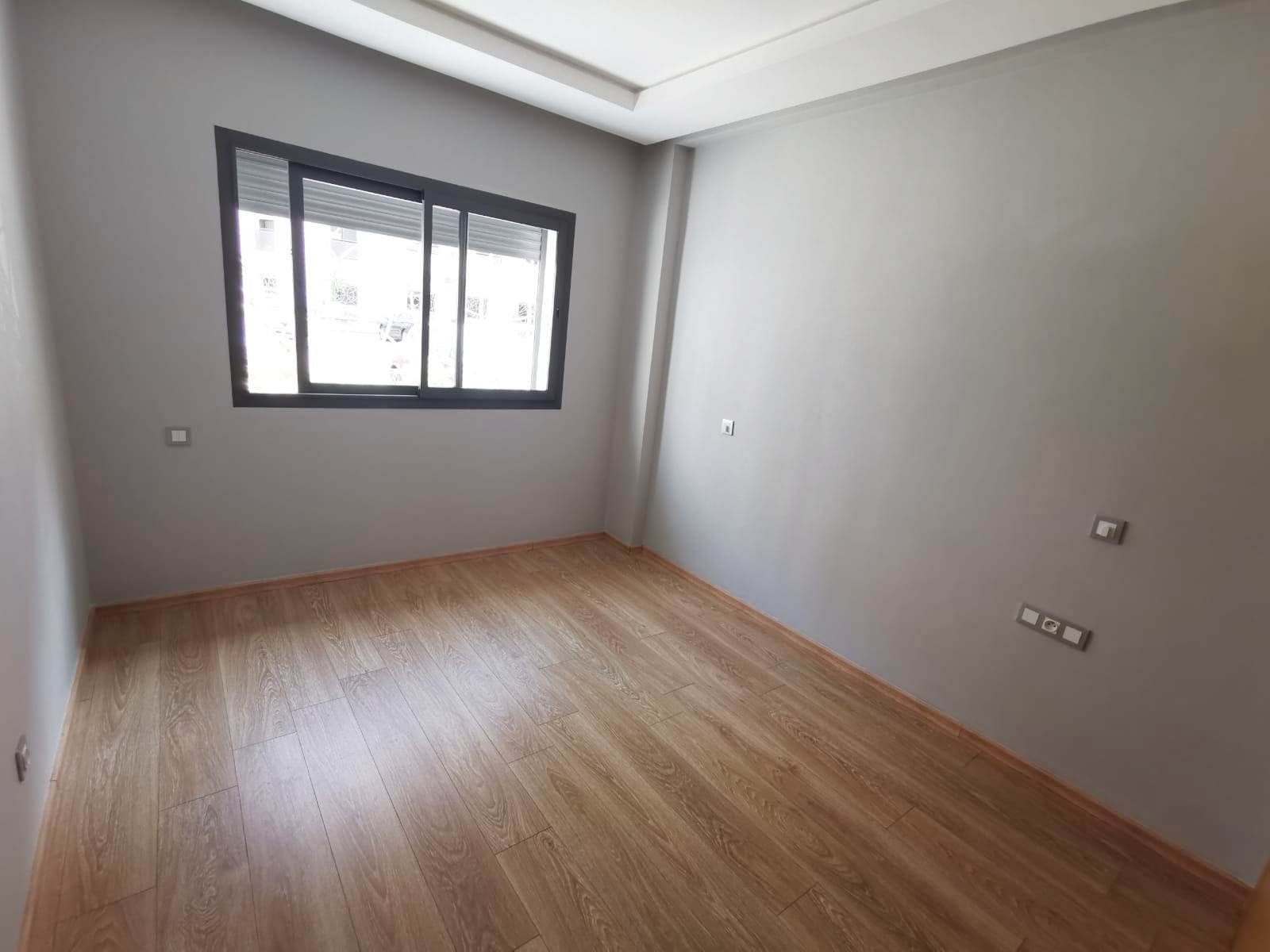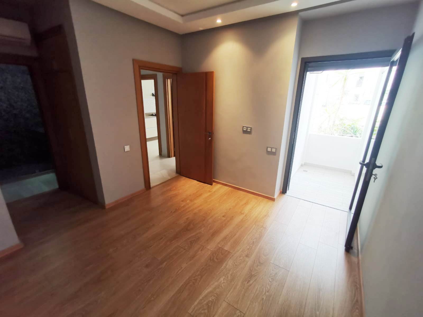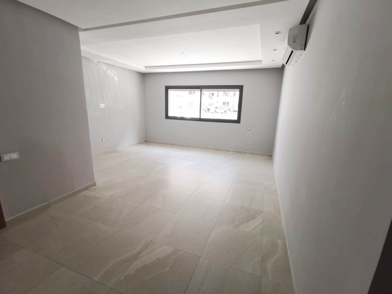Bel appartement au rez de chaussé neuf à louer vide en Location longue durée, lumineux, situé dans une résidence très sécurisée et calme en plein centre ville d'Agadir. Il se compose de: 2 chambres avec placards dont une suite parentale climatisée et avec dressing et SDB privative, un salon, séjour climatisé, une cuisine semi équipée et une 2ème salle de bain.