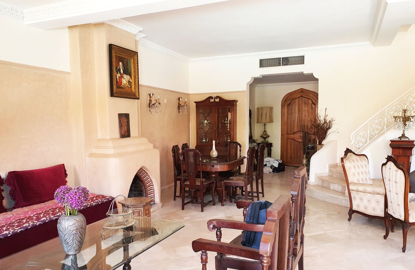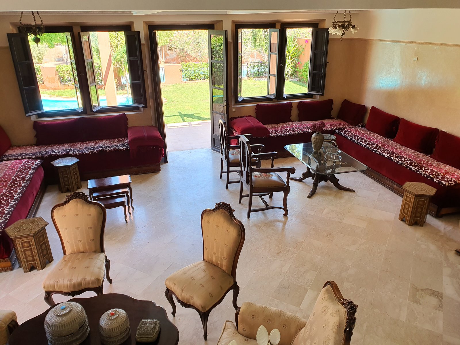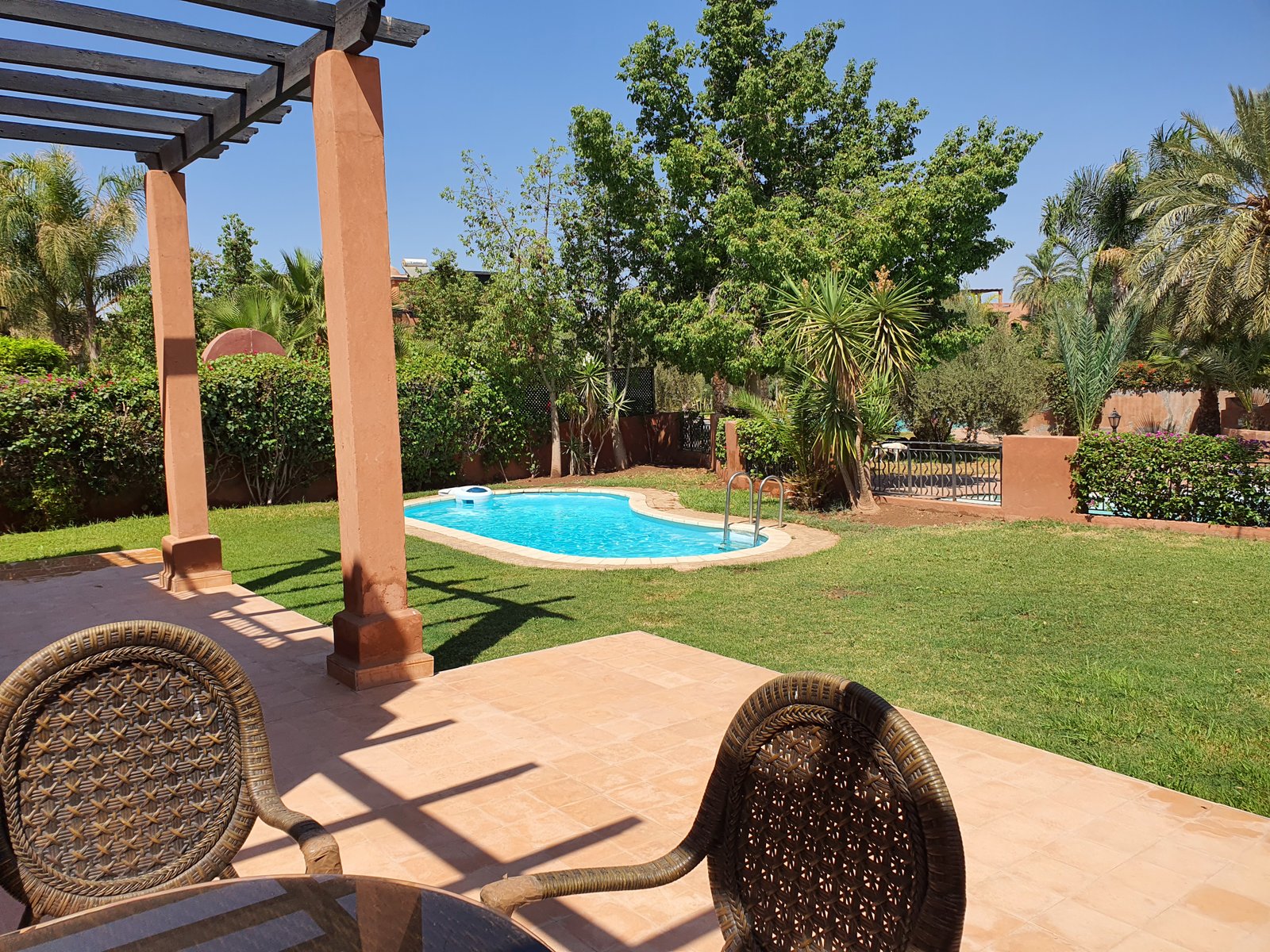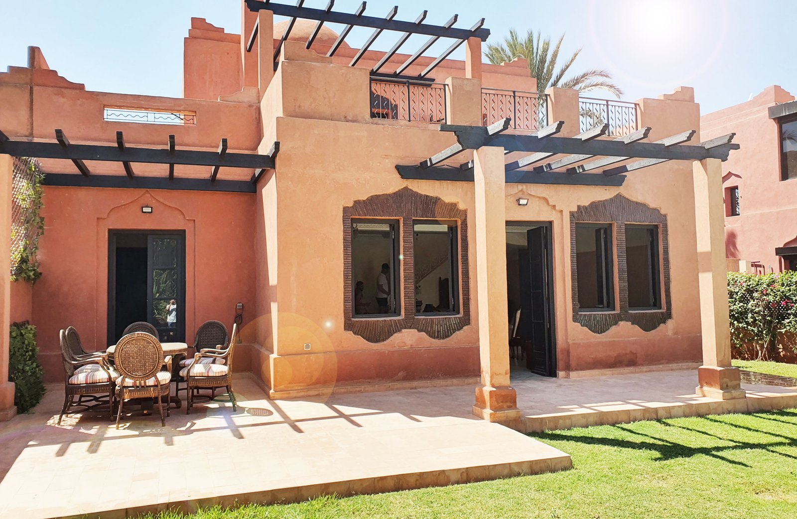 Villa au charme traditionnel de Marrakech, à louer à River Palm. La résidence est connue pour ses fameuses lagunes parcourant chaque villa, en plus des piscines privées. Un vrai oasis qui fait le bonheur des familles, des jeunes couples, ou des personnes retraitées qui cherchent le dépaysement total. La villa sur deux étages dispose de meubles en très bon état, de 1 chambre parentale spacieuse et 2 autres chambres, 3 salles de bain, 1 grand salon marocain, 1 petit salon victorien, 1 coin salle à manger, 1 cuisine entièrement équipée, des terrasses sur les deux étages, 1 place de Parking avec la possibilité de stationner le long de la rue aussi, un jardin avec piscine, la résidence se situe proche du grande stade de Marrakech, à 5min de la Palmeraie et seulement 15 à 20 min du centre ville. C'est une zone idéale pour les personnes qui cherchent le repos et la tranquillité.