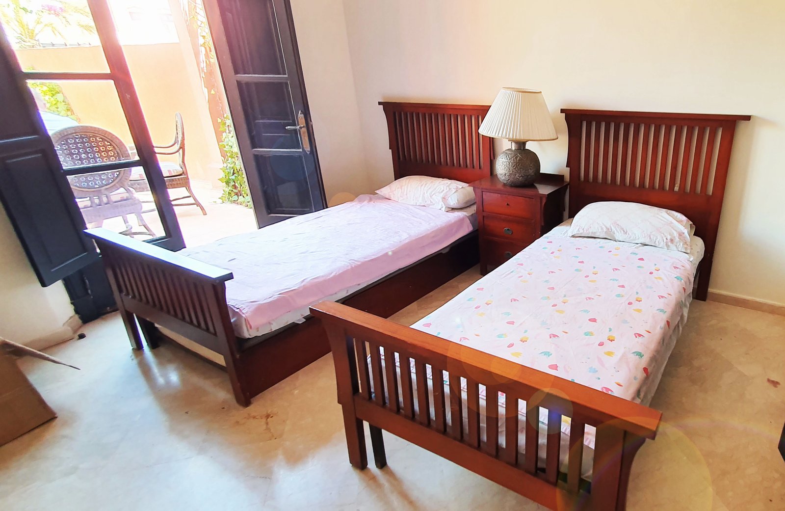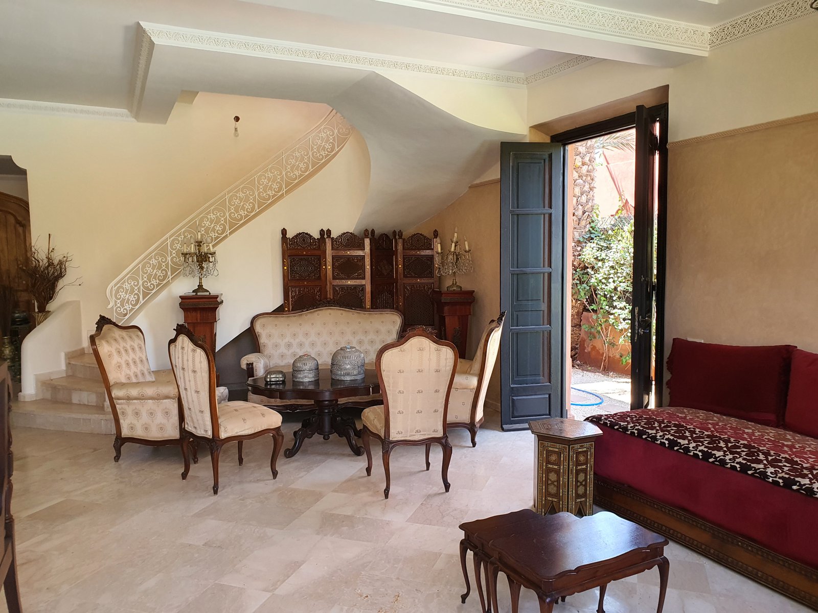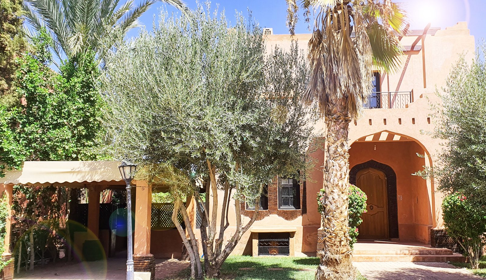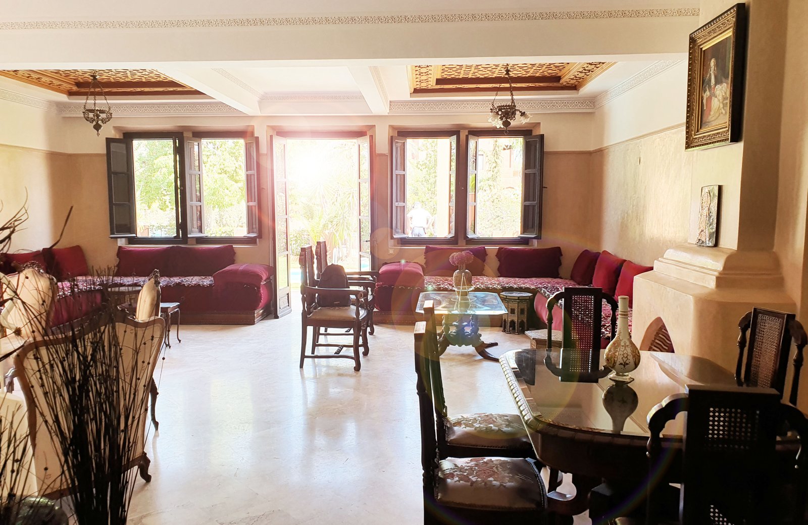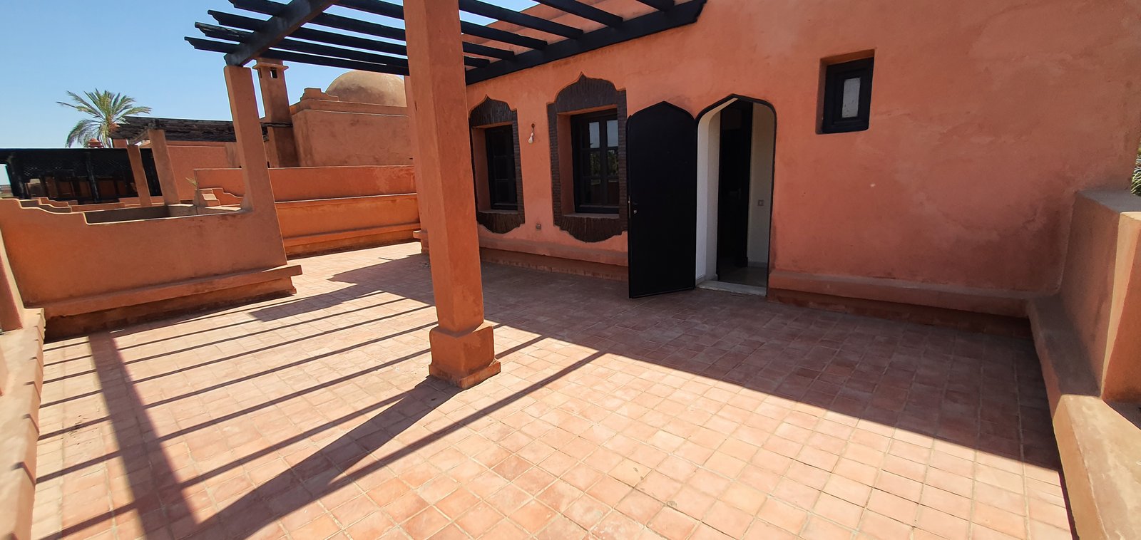 Villa au charme traditionnel de Marrakech, à louer à River Palm. La résidence est connue pour ses fameuses lagunes parcourant chaque villa, en plus des piscines privées. Un vrai oasis qui fait le bonheur des familles, des jeunes couples, ou des personnes retraitées qui cherchent le dépaysement total. La villa sur deux étages dispose de meubles en très bon état, de 1 chambre parentale spacieuse et 2 autres chambres, 3 salles de bain, 1 grand salon marocain, 1 petit salon victorien, 1 coin salle à manger, 1 cuisine entièrement équipée, des terrasses sur les deux étages, 1 place de Parking avec la possibilité de stationner le long de la rue aussi, un jardin avec piscine, la résidence se situe proche du grande stade de Marrakech, à 5min de la Palmeraie et seulement 15 à 20 min du centre ville. C'est une zone idéale pour les personnes qui cherchent le repos et la tranquillité.
