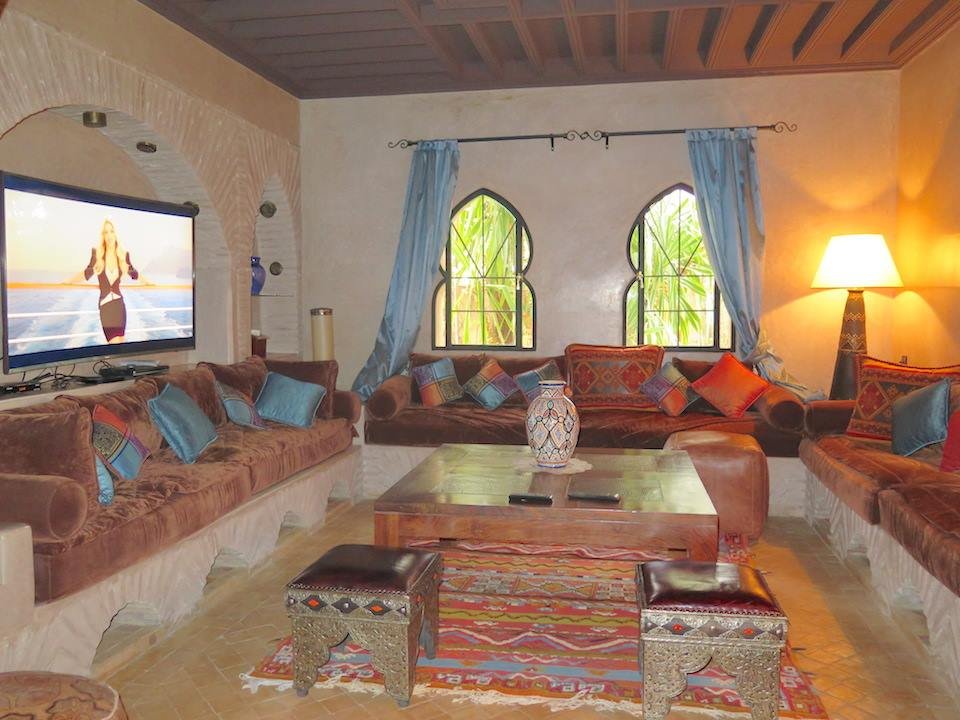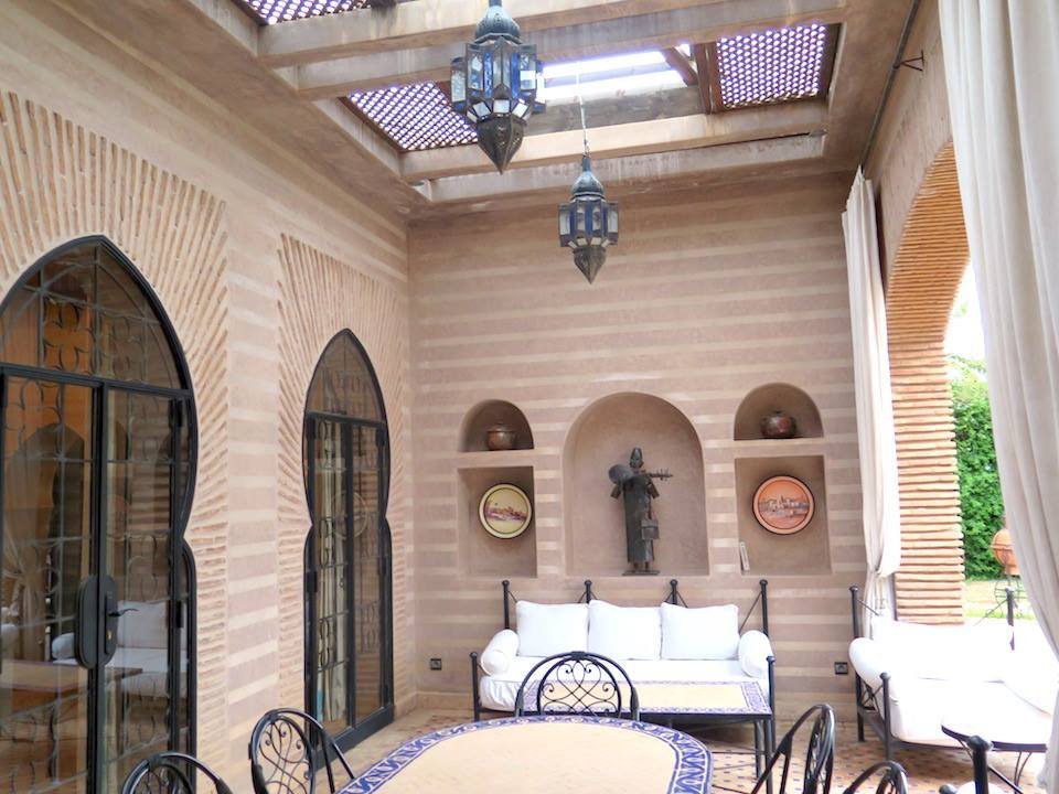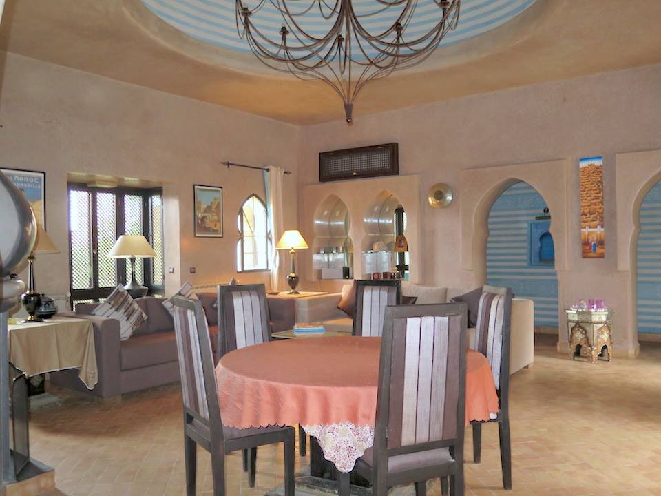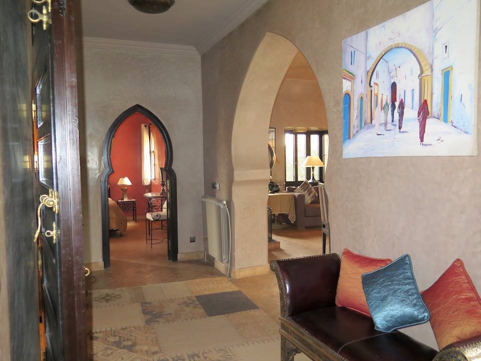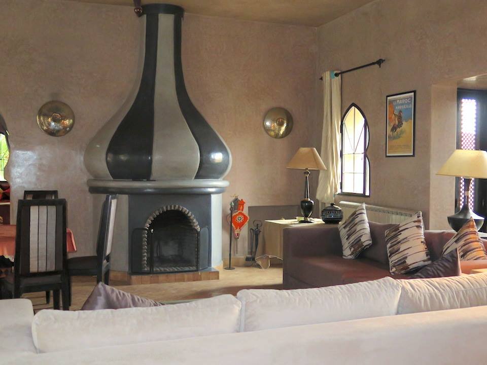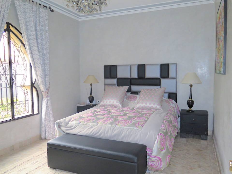 L'agence TINASS IMMO, vous propose en location longue durée, dans un domaine fermé et sécurisé 24h sur 24, une belle villa à la décoration marocaine avec beaucoup de goût et en excellent état. Construite sur 550 m2 habitable en plain pied, composée: - Un Salon européen spacieux avec cheminée ouvert sur jardin et la piscine; - Un salon-Télé au style marocain marocain; - Une cuisine moderne entièrement équipée avec un plan de travail et plein de rangements. - et des toilettes visiteurs; - Trois belles chambres toutes avec salles de bains et dressing donnant sur le jardin; - Une suite parentale d'environ 120 m² avec accès privatif : une chambre à coucher, un grand dressing, un petit-salon; un bureau (pouvant être transformable en chambre pour enfant ou salle de gym) et un hammam beldi. Une superbe terrasse bien aménagée avec espace pergola, bar d'été, barbecue...offrant une vue à 360° sur les beaux espaces verts de la résidence et sur l'Atlas. Une buanderie et une chambre pour le personnel avec Toilettes. Toutes les pièces sont climatisés (réversibles) Le tout complété par une piscine chauffée et un vaste jardin avec une pergola. Plusieurs espaces de rangements ont été aménagés dans la villa. Garage au sous-sol pour 2 à 3 voitures. Le domaine Amelkis est très bien gérée par un syndic professionnel, offre en plus du Golf, un club-house, de ces beaux espaces verts et des espaces jeux pour les enfants et une grande piscine collective. Proximité des golfs (Royal,et Al Maaden); écoles américaine, centre ville est à 10mn. Le loyer est de 32.000 DH/ mois charges de co-propriété Comprises.