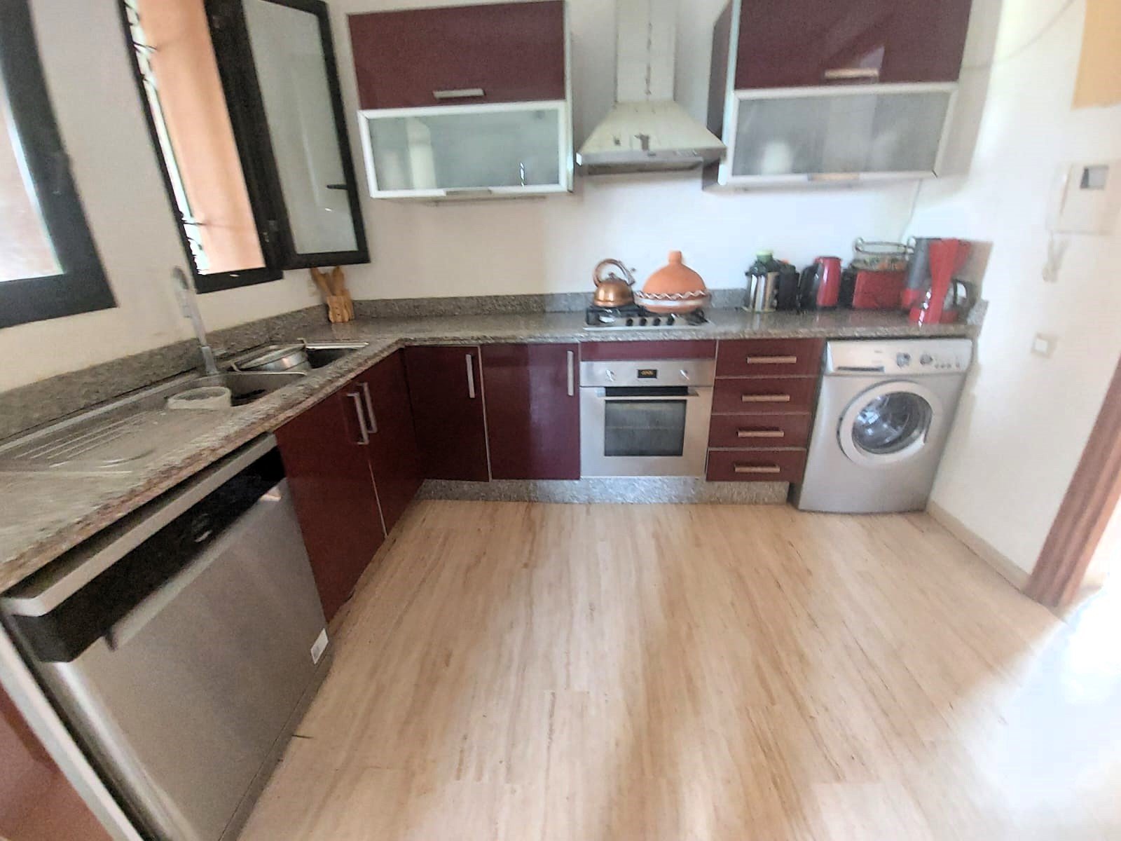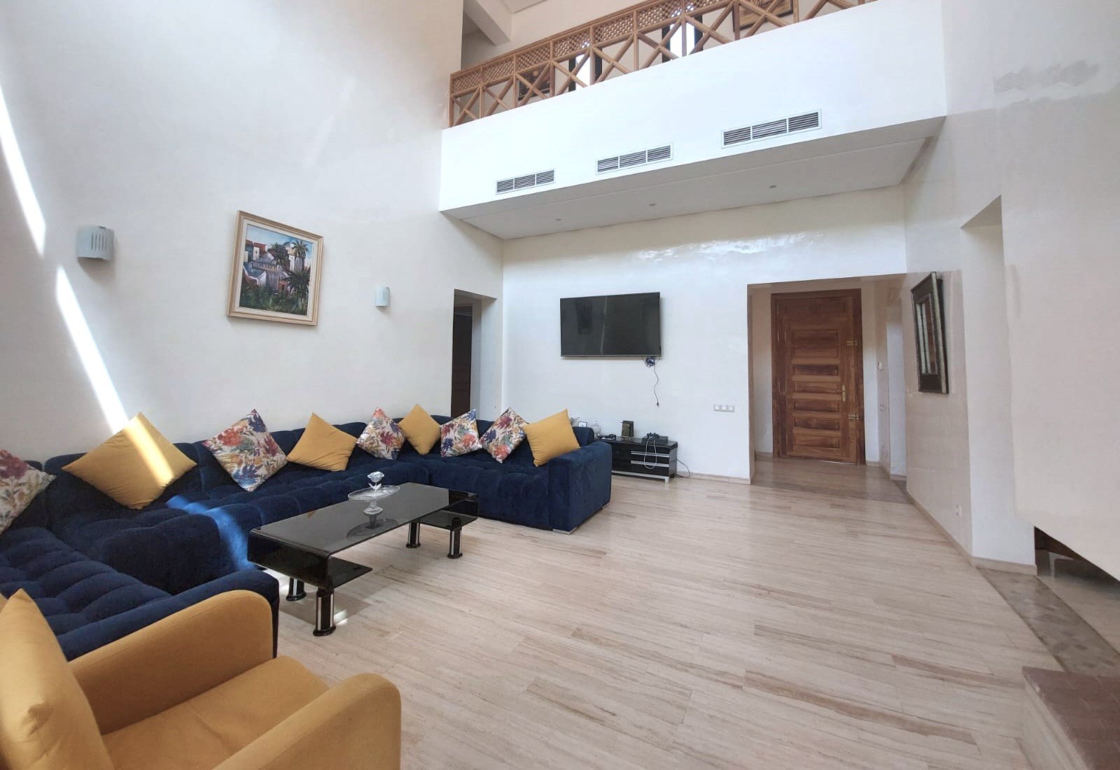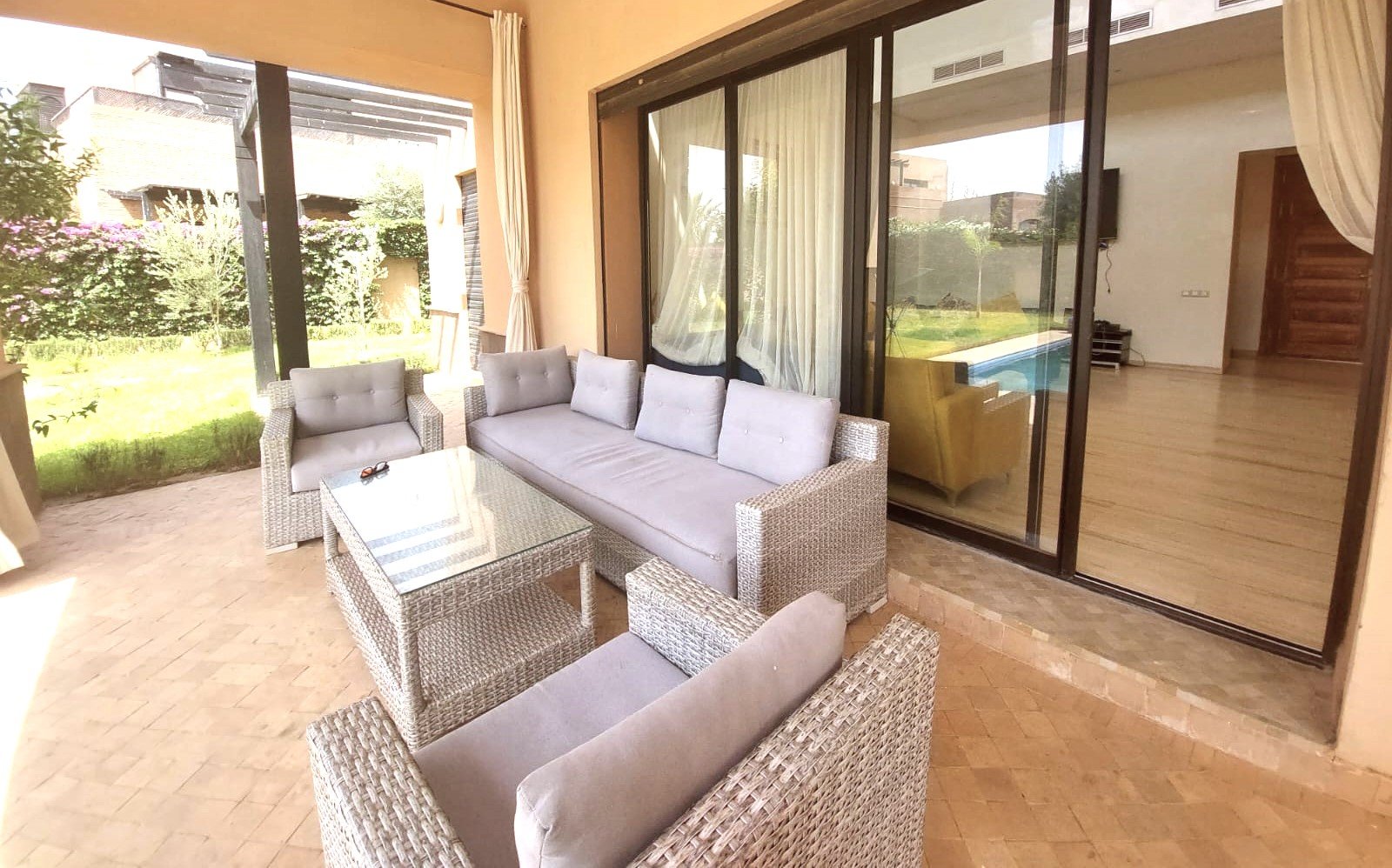Très Jolie Villa Neuve à Louer Meublée avec Beau Jardin et Piscine Privative situé Dans Une Résidence Sécurisée sur la Route de Fes 12 KM de Centre de Marrakech ;Elle Se Compose de 4 Chambres 2 Salon 1 Cuisine équipée 3 SDB Jardin et Piscine