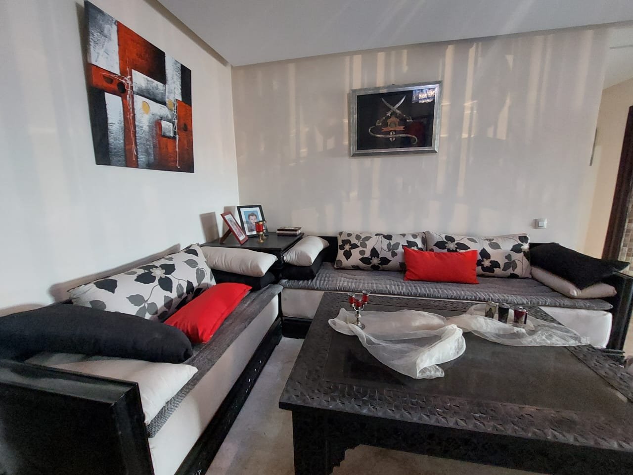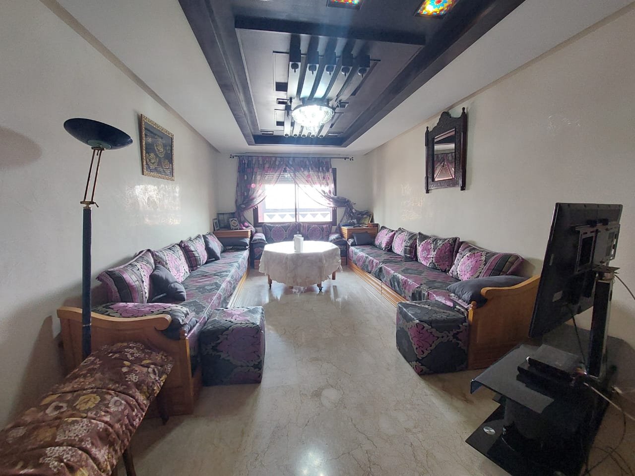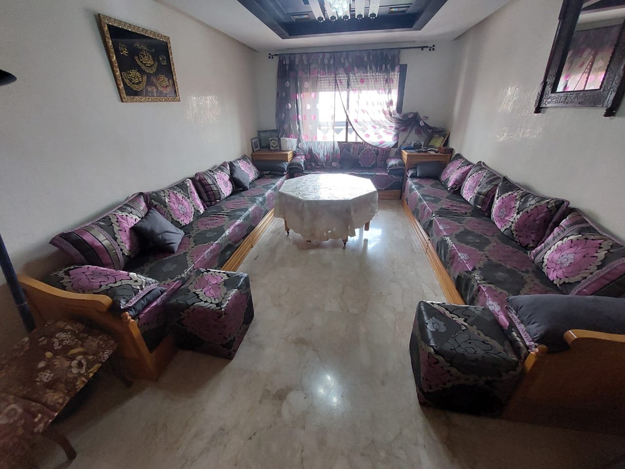 A louer en longue durée, ce spacieux appartement meublé ou semi-meublé sans vis à vis de 126m², un grand balcon sur toute la largeur de l’appartement bien ensoleillé, et sécurisé. Situé au 4 étage, dans un immeuble bien entretenu et sécurisée avec ascenseur et parking sous-terrain, composé de 2 grandes chambres, d'un salon marocain spacieux et d'un salon européen. 2 salles de bains avec toilettes, et une salle de bain attenante à la chambre parentale. la cuisine est bien équipée Possibilité de louer l'appartement semi-meublé (7500 dh) ou de remplacer certains meubles (salon marocain par un salon européen) à 8500 dh charges de syndic incluses.