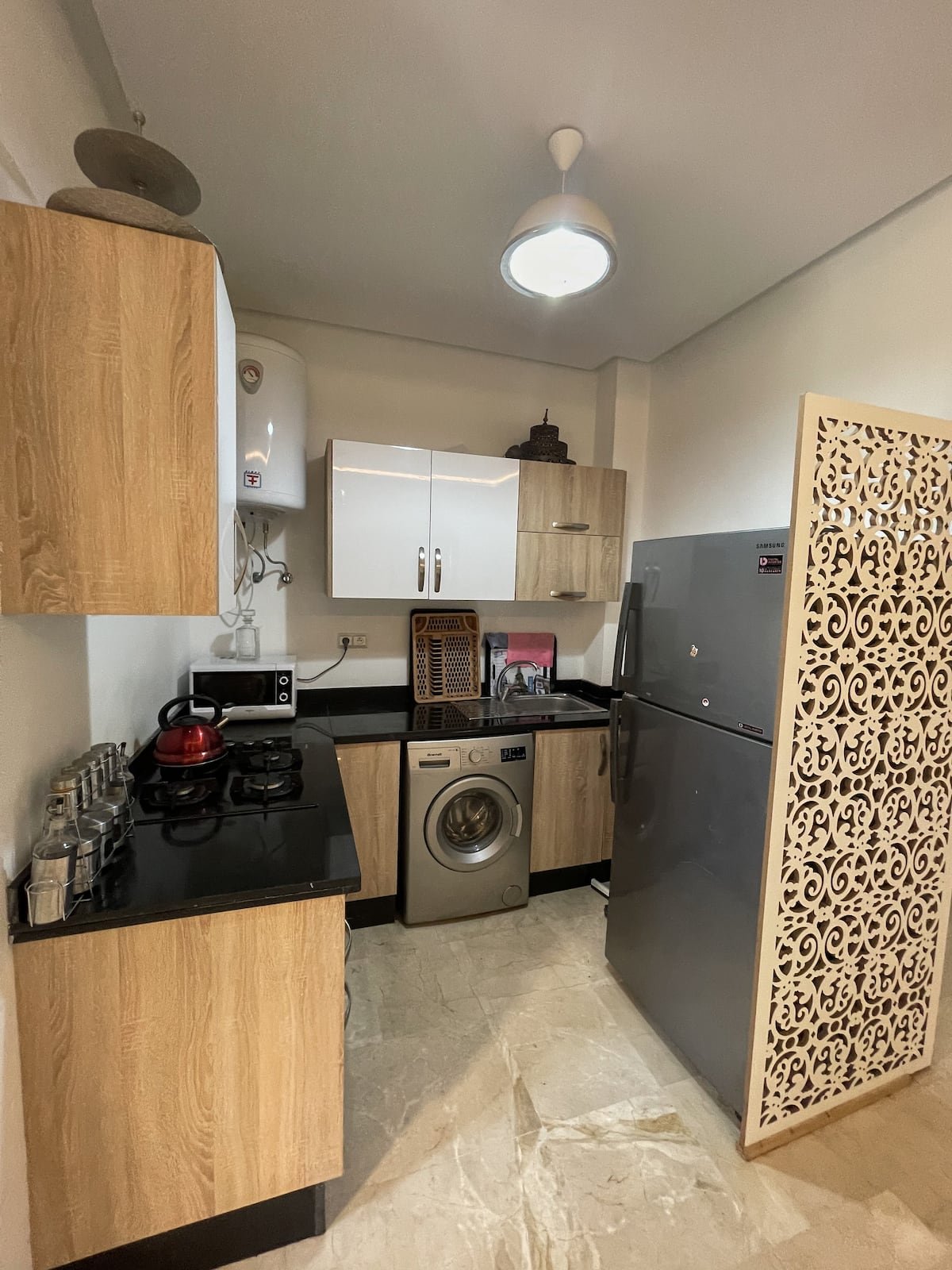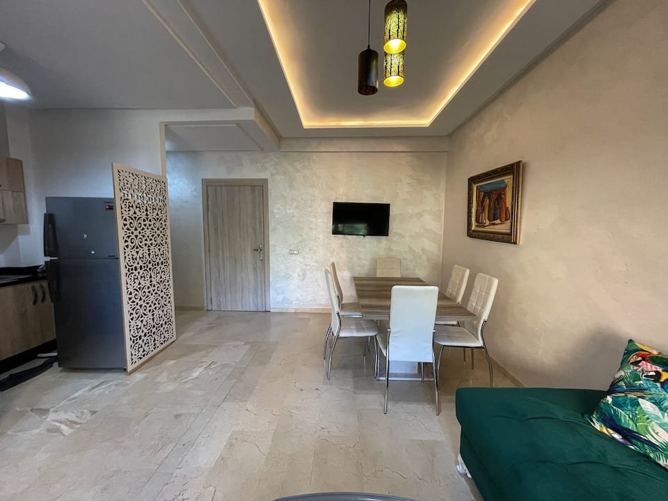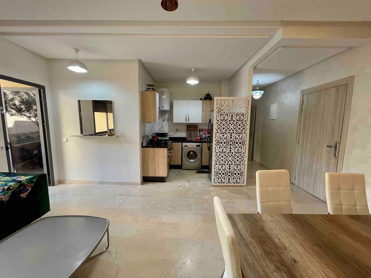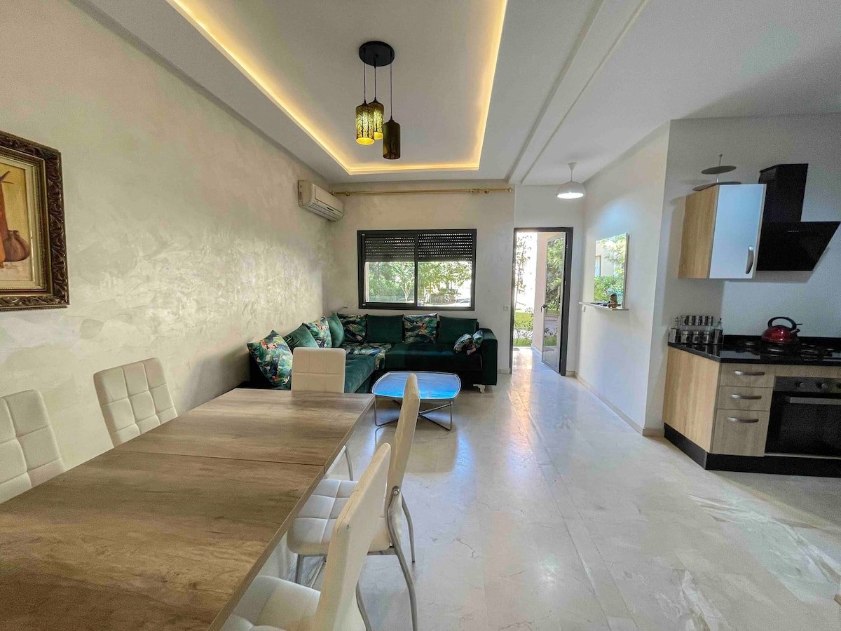 Appartement bien meublé au Rez de jardin ( RDC ) situé dans une résidence avec piscine collective, espaces verts et place parking à Targa . Loyer : 6.500 DH l'appartement est composé de : - 2 chambres à coucher - 1 salon - 1 salle de bain - cuisine équipée avec petite terrasse privée - jardin privé - piscine collective - parc de jeux pour les enfants - place parking - concierge